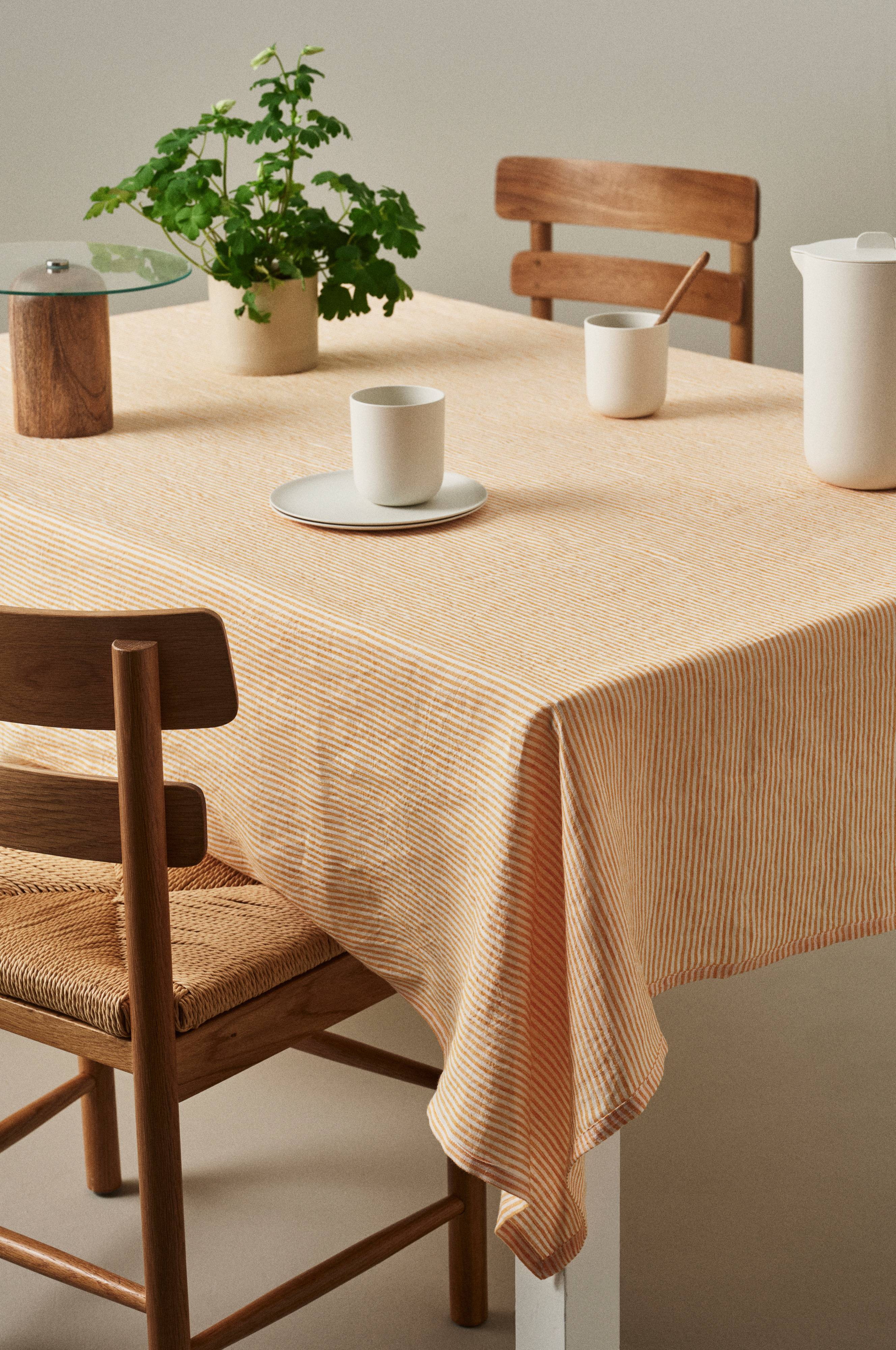 Eine Leinentischdecke mit Webstreifen. Die Kombination von garngefärbten Streifen und Reinleinen ist Landhausoptik pur. Der Stoff ist ausgesprochen pflegeleicht und glattgebügelt ebenso schön wie „naturbelassen".