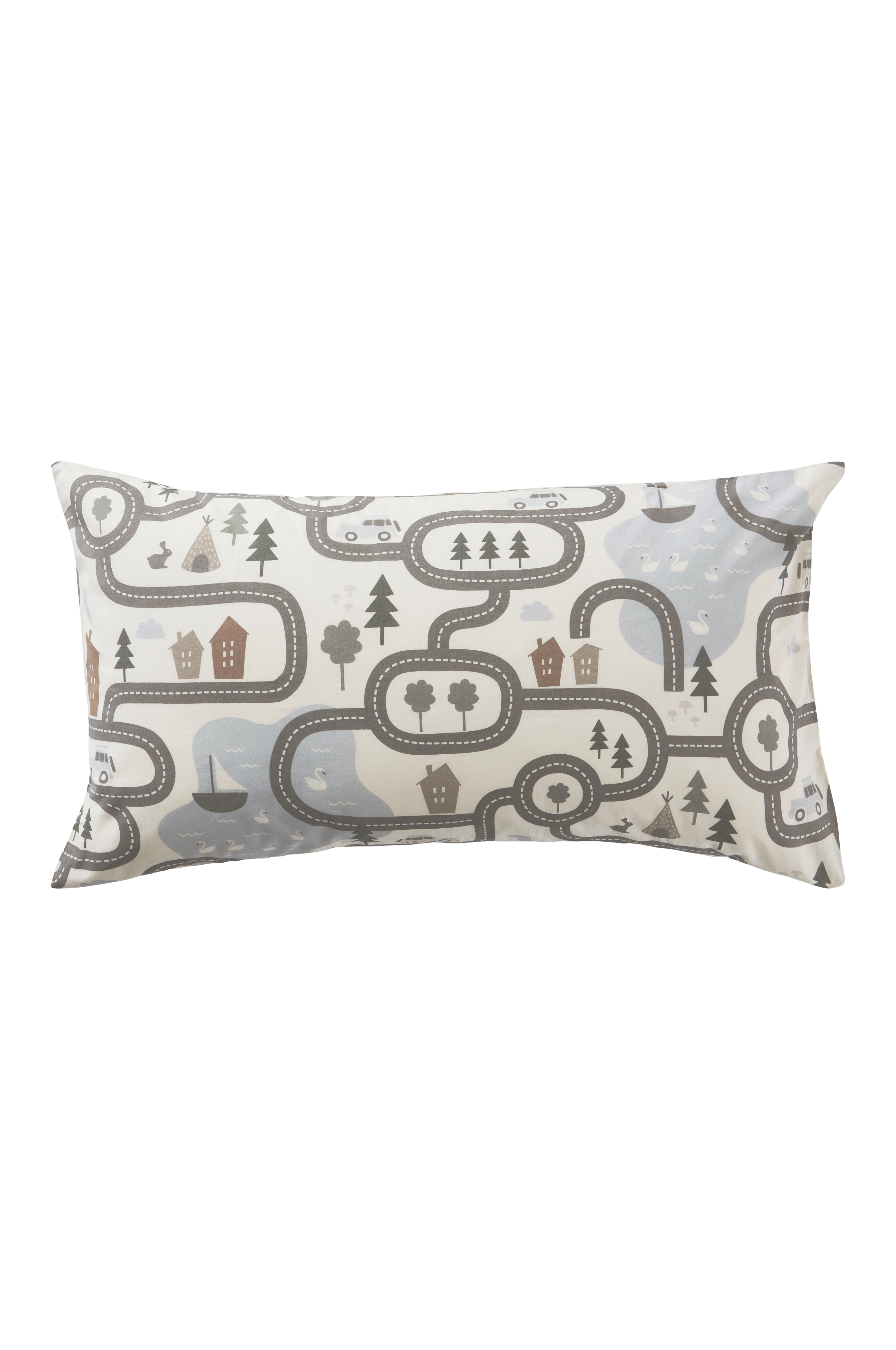 Kopfkissenbezug aus Bio-Baumwolle mit einem Musterprint in harmonischen Farben. Das Motiv zeigt eine belebte Stadt mit Straßen, Häusern, Tieren und Natur. Bettwäsche aus kühler, weicher Bio-Baumwolle ist sehr angenehm auf der Haut. Fadendichte 144 TC. (Mit der Fadendichte bzw. dem TC-Wert (Thread Count) wird die Anzahl der Fäden in Kette und Schuss pro Quadratzoll angegeben. Je höher die Fadendichte, desto höher die Qualität.)