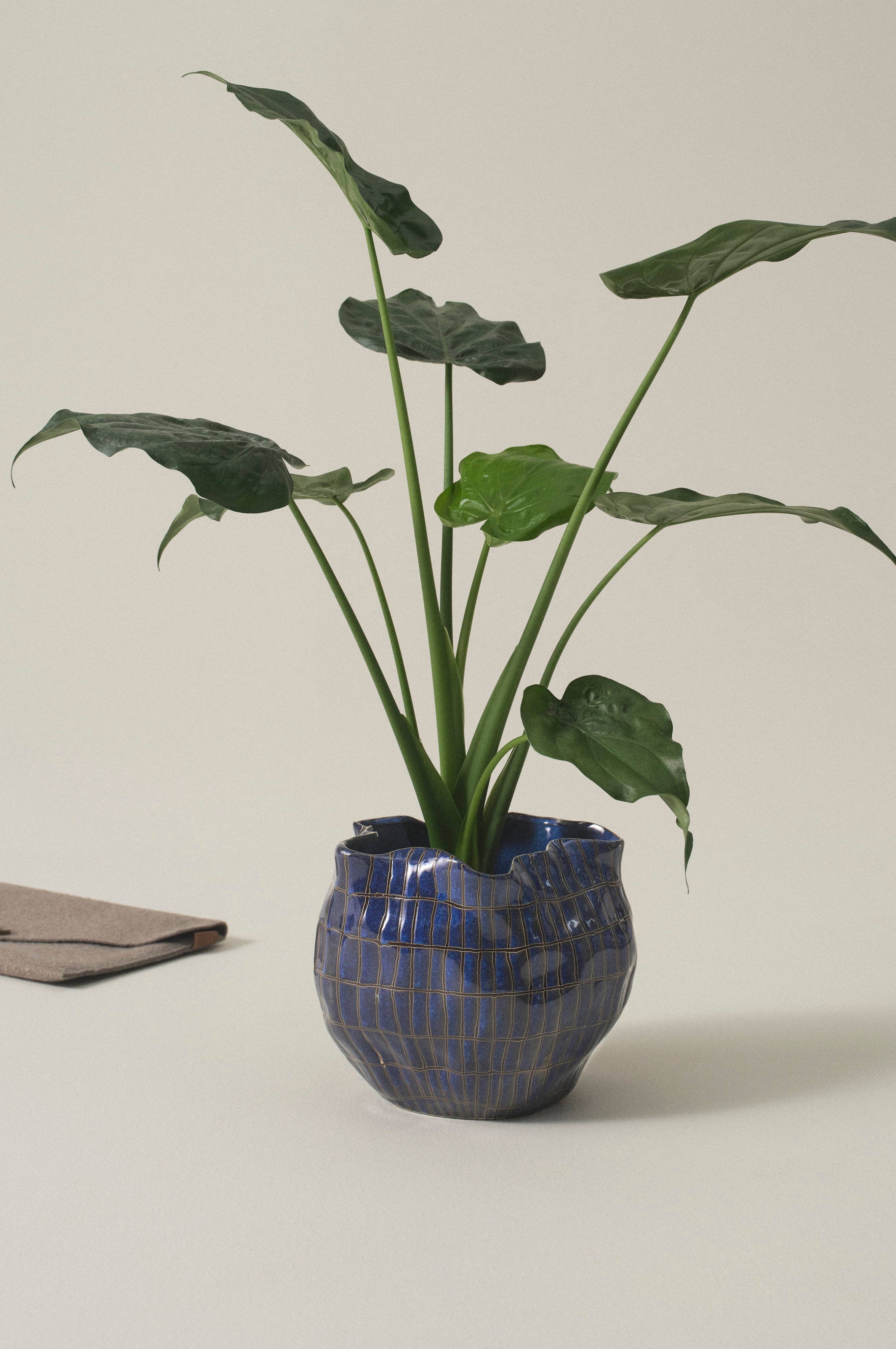Ein handgefertigter Keramiktopf mit einer gewellten, asymmetrischen Form und einem dezenten Schachbrettmuster in gedeckten Farben, das die Form für sich selbst sprechen lässt. Der Topf hat eine glänzende Glasur und ist auch innen glasiert. Da dieser Artikel von Hand gefertigt wird, ist jedes Exemplar ein Unikat. Keramik ist feuchtigkeitsdurchlässig.