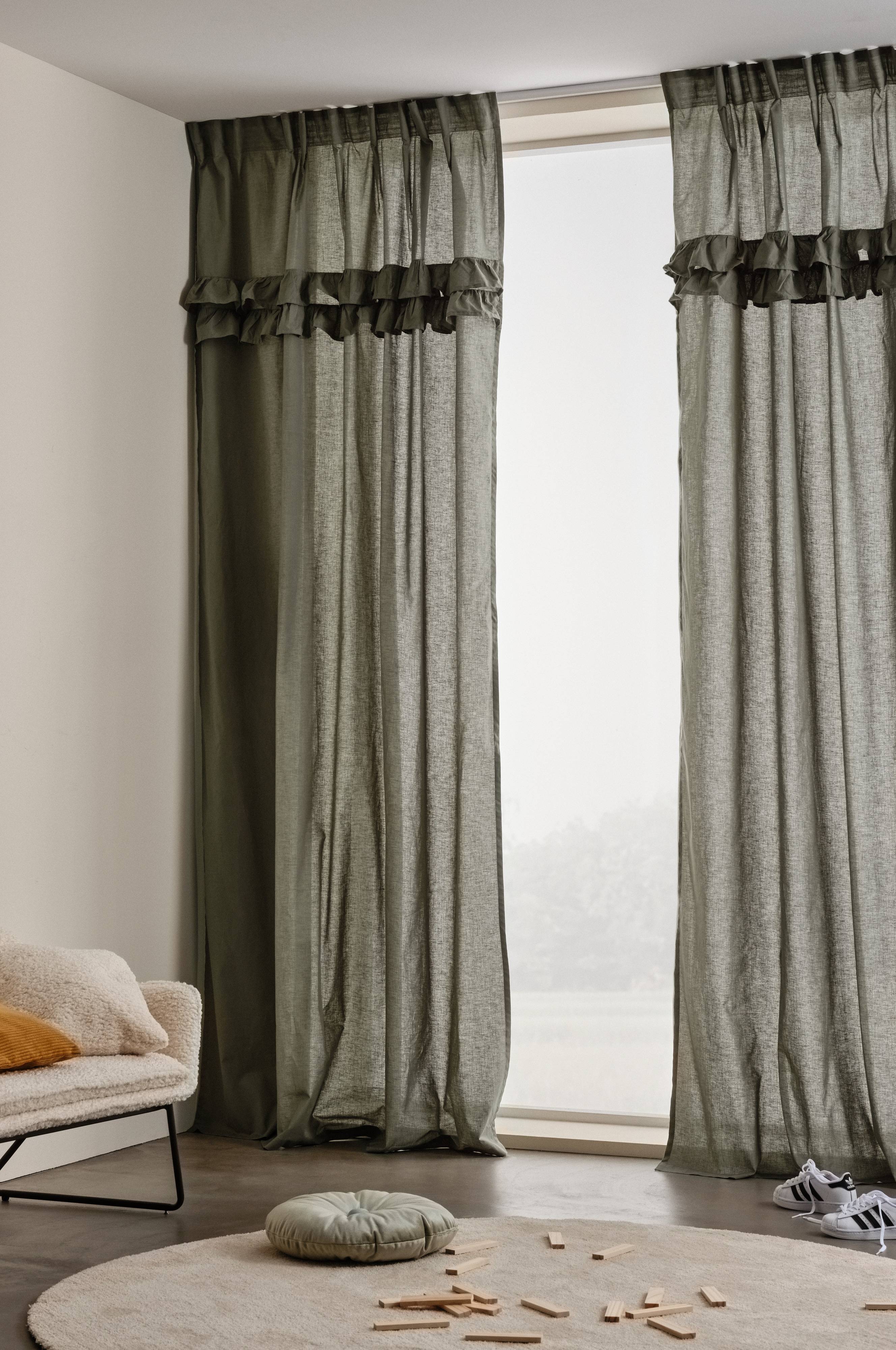2er-Pack Vorhanglängen aus Bio-Baumwolle. BILLY ist eine einfarbige Gardine mit dekorativen Rüschendetails und aufgenähtem Multifunktionsband.