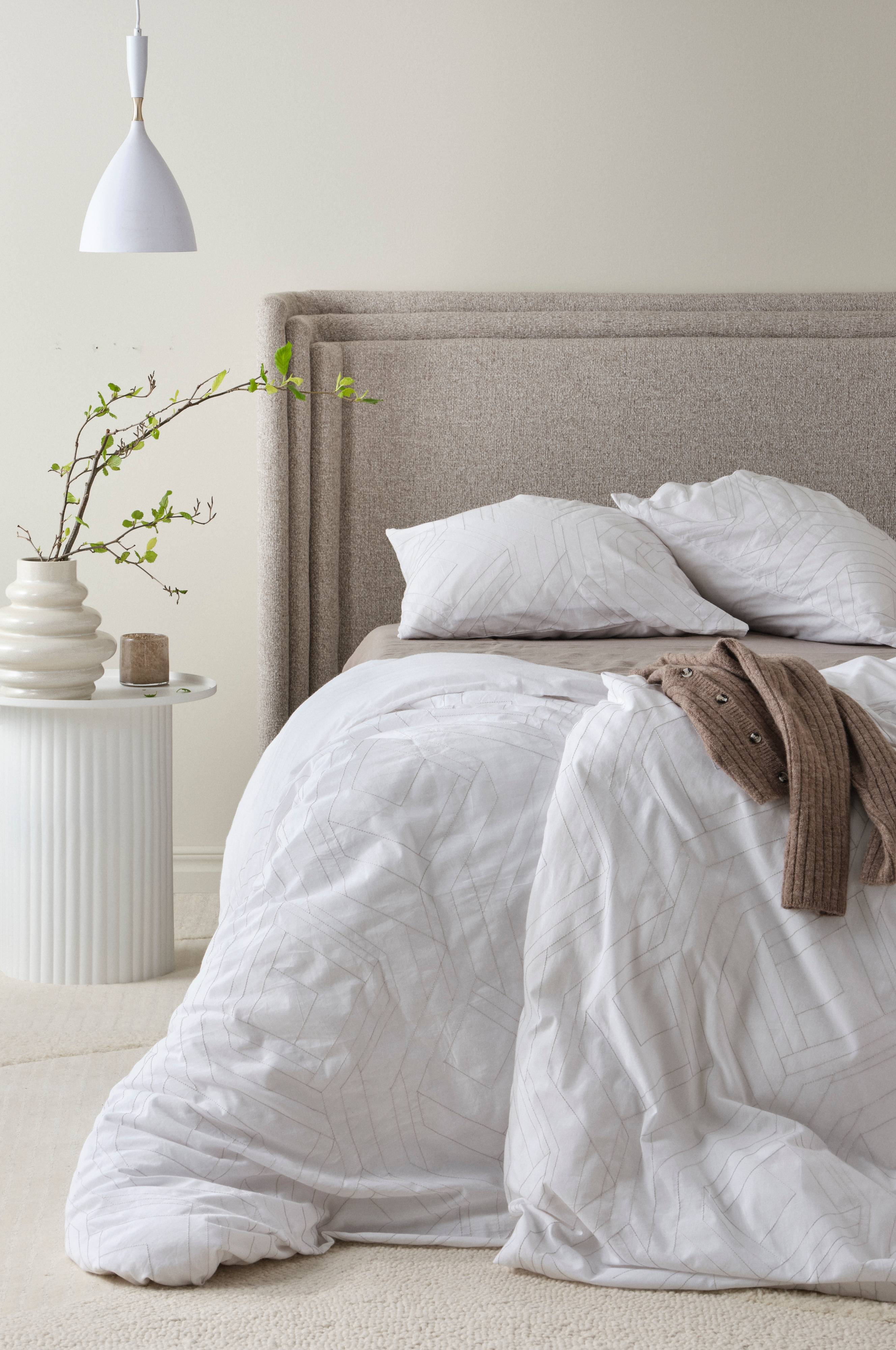 Bettbezug aus behaglicher Baumwolle. Diesen Bettbezug ziert ein Stickmuster, das sich dank des dünnen, fast identisch getönten Fadens sehr dezent präsentiert. Die einfarbige Rückseite ist aus der gleichen Qualität wie die Vorderseite gearbeitet. In weicher, kühler Baumwolle schlummert es sich überaus angenehm. Dank der Öffnung an den oberen Ecken des Bettbezugs lässt sich die Bettdecke im Handumdrehen beziehen. Modell mit Reißverschluss. Fadendichte 144 TC. (Mit der Fadendichte bzw. dem TC-Wert (Thread Count) wird die Anzahl der Fäden in Kette und Schuss pro Quadratzoll angegeben. Je höher die Fadendichte, desto höher die Qualität.)