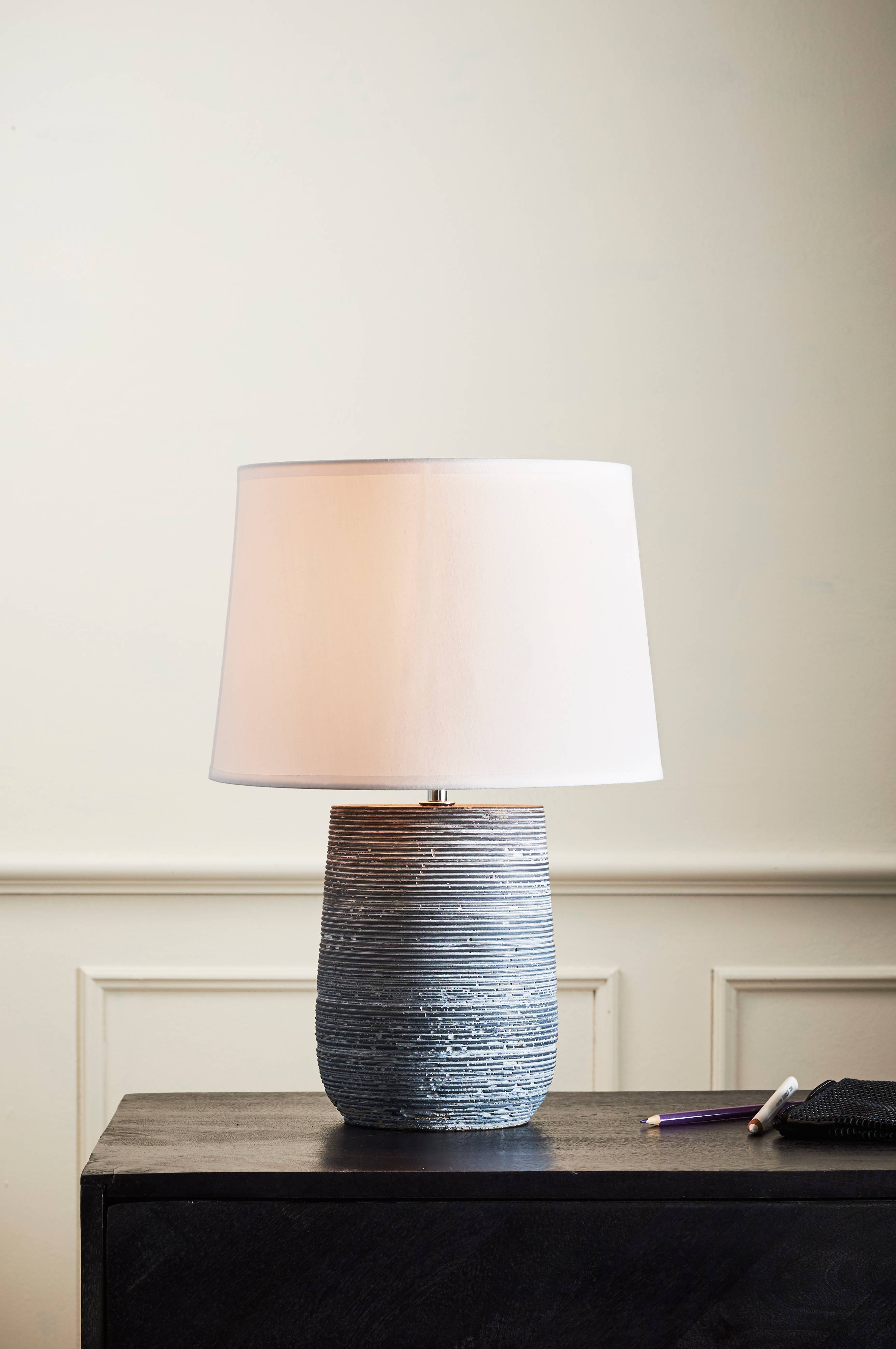 Beschreibung: Tischleuchte mit Baumwollschirm und Zementfuß. Kabellänge 1,1 m. Ohne Leuchtmittel.