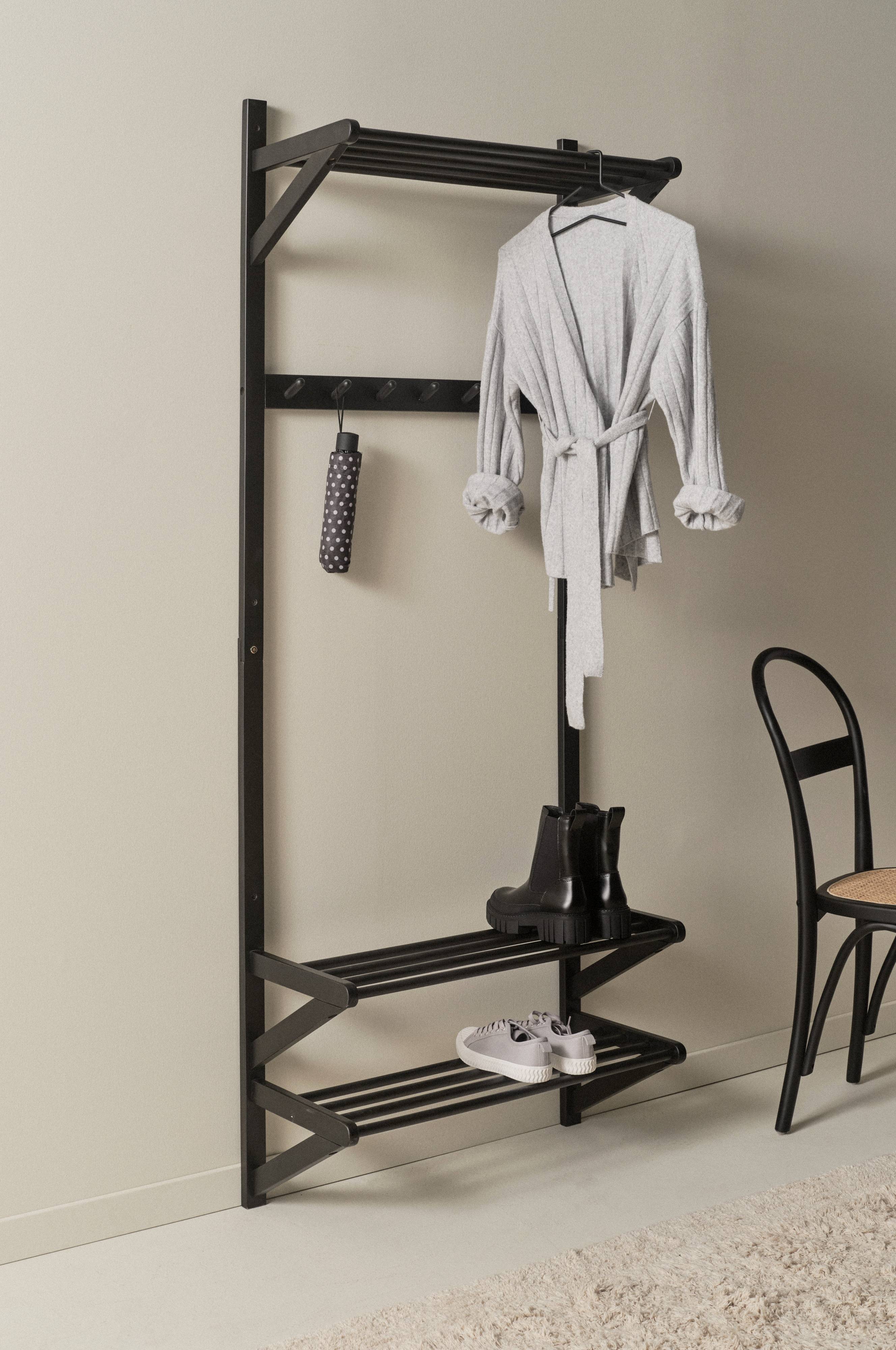 Die Garderobe COLE aus FSC-gekennzeichnetem, gekalktem Kiefernholz besteht aus einer Hutablage, einer Hakenleiste und zwei Schuhregalen. Die Hakenleiste hat sieben gerade, nach oben abgewinkelte Aufhänger, an denen Kleider und Taschen sicher und rutschfrei hängen. Der äußere Rundstab an der Hutablage ist perfekt für Kleiderbügel (nicht enthalten). Die Garderobe wird auf gewünschter Höhe an die Wand geschraubt. Einige Montageschritte sind erforderlich. Inklusive Montageanleitung.