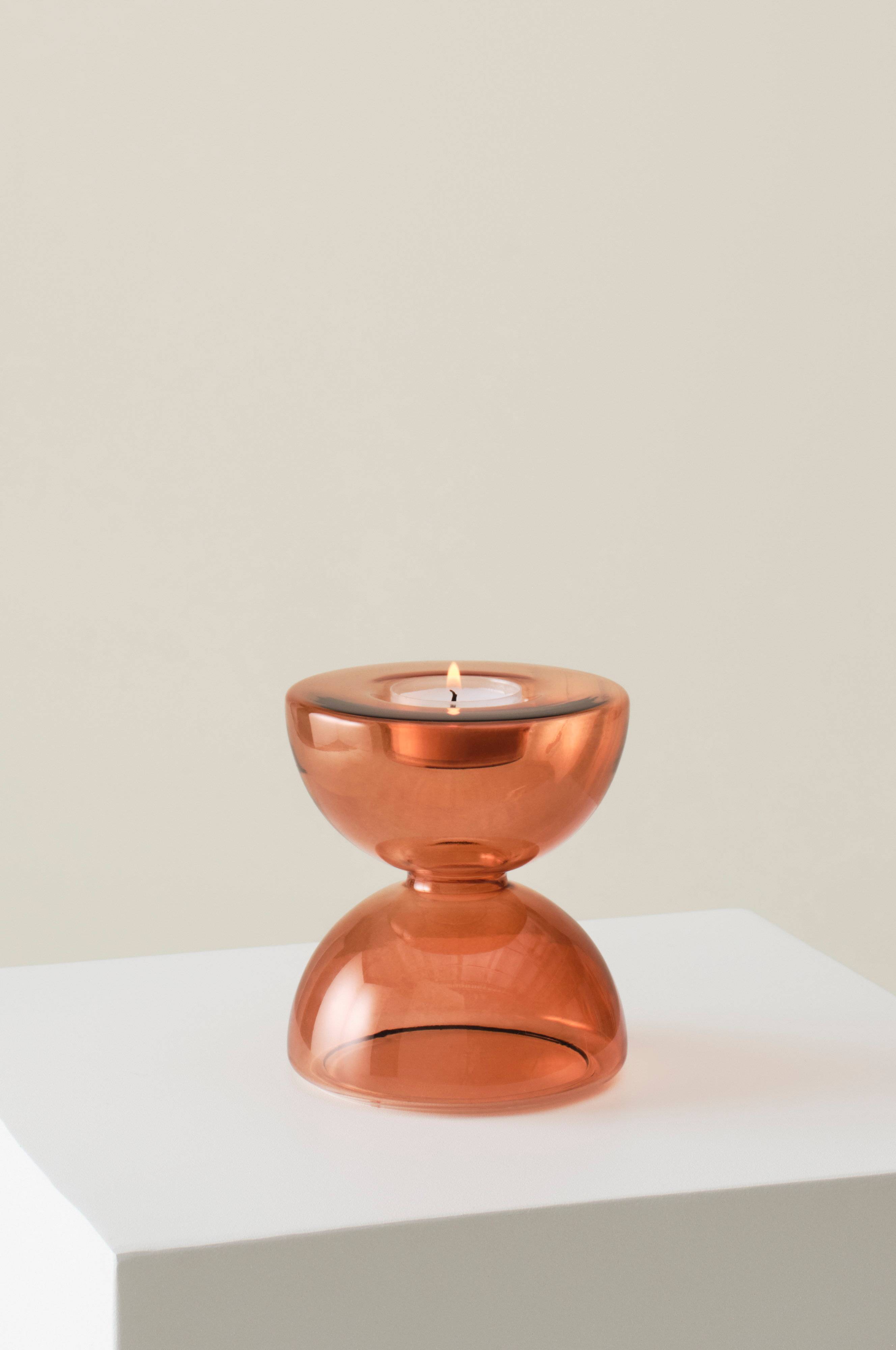 Der handgefertigte Kerzenhalter ECHO aus Glas erinnert mit seiner soften Formgebung an eine Eieruhr. Das Modell ist auf Teelichter abgestimmt.