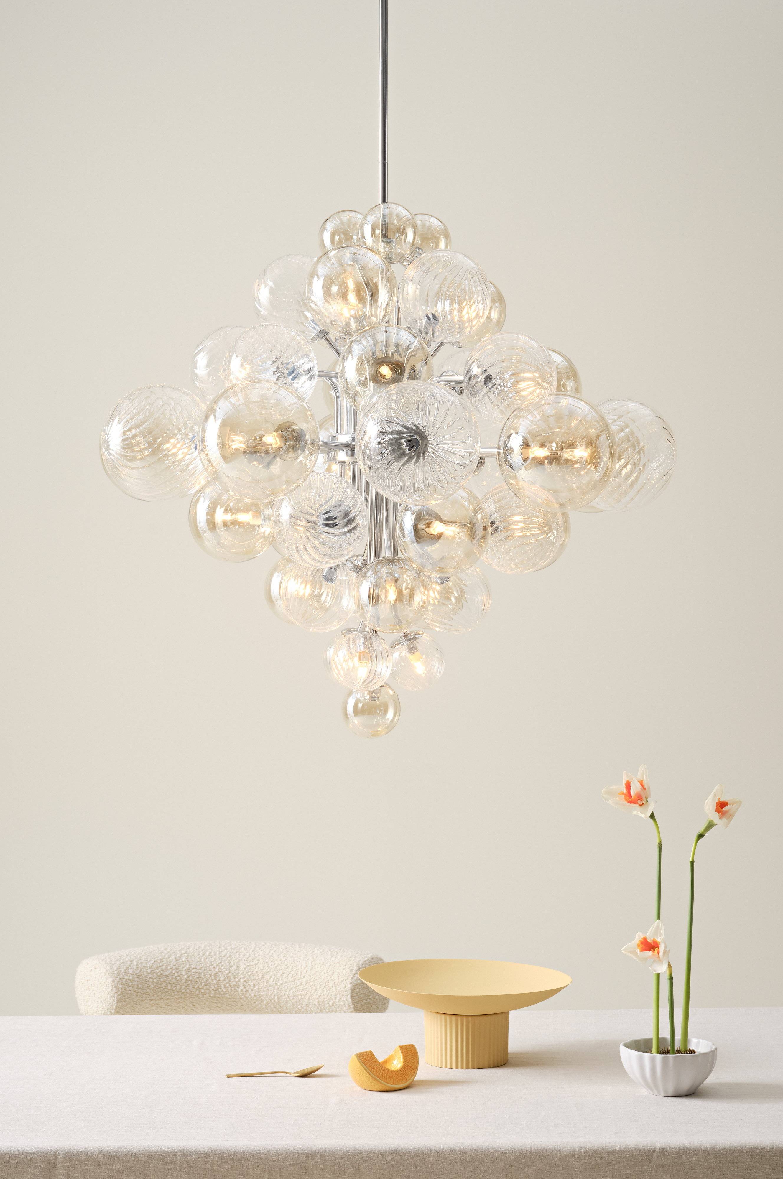 Deckenleuchte mit verchromtem Eisengestell und dekorativen Klarglasschirmen, die ein gemütliches Licht verbreiten, wenn sie leuchten. Transparent, Schnurlänge 0,72 m.