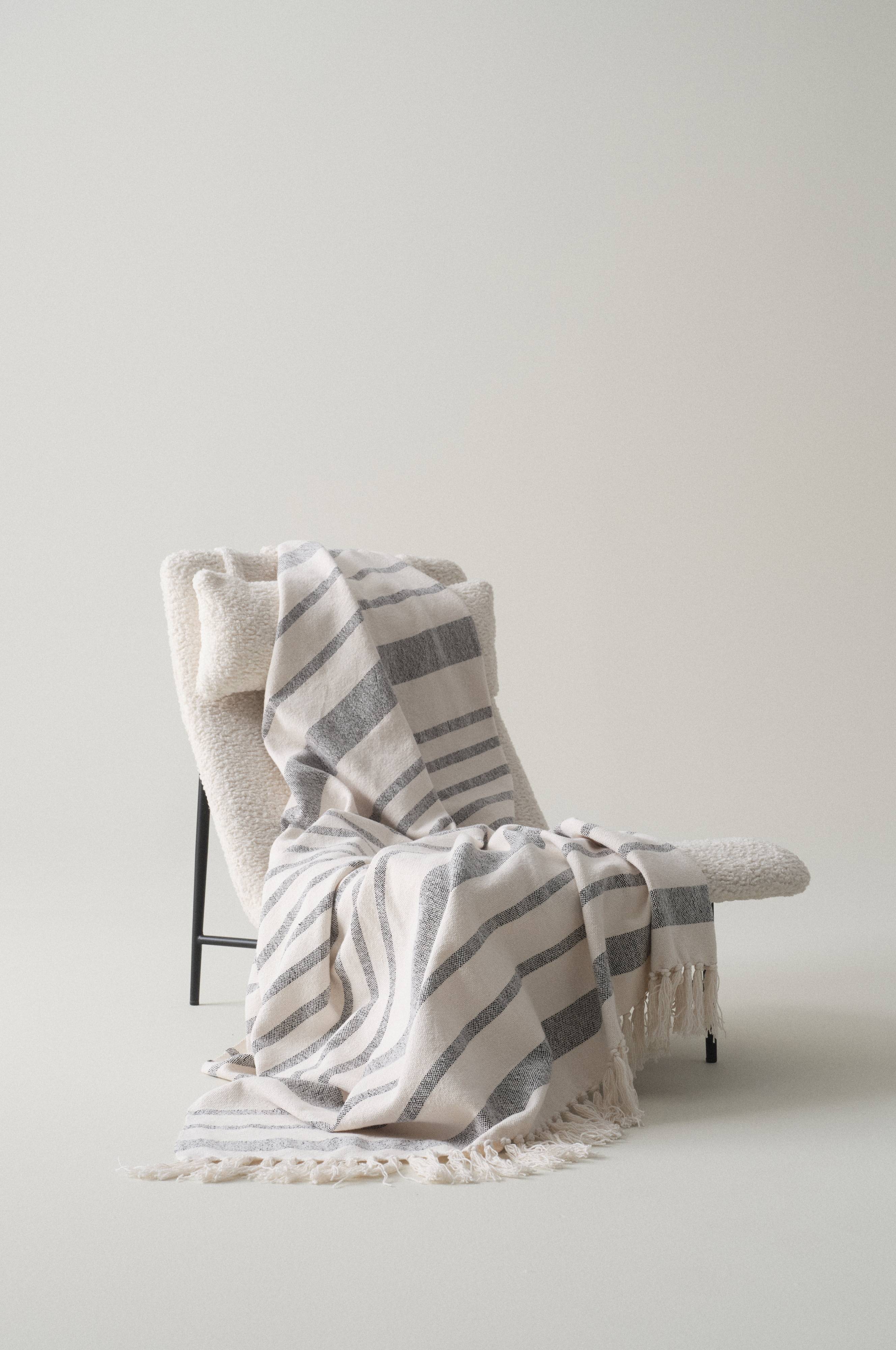 Handgewebtes Plaid aus Baumwolle, mit Webstreifen und geknoteten Fransen an zwei Seiten. Weiche, dichte Baumwollqualität. Unser luftiges, behagliches Sommerplaid ELLY ist nicht zu warm und genau richtig für laue Sommerabende. Natürlich ist es auch eine Zierde fürs Sofa, wo es das ganze Jahr über zu seinem Recht kommt.