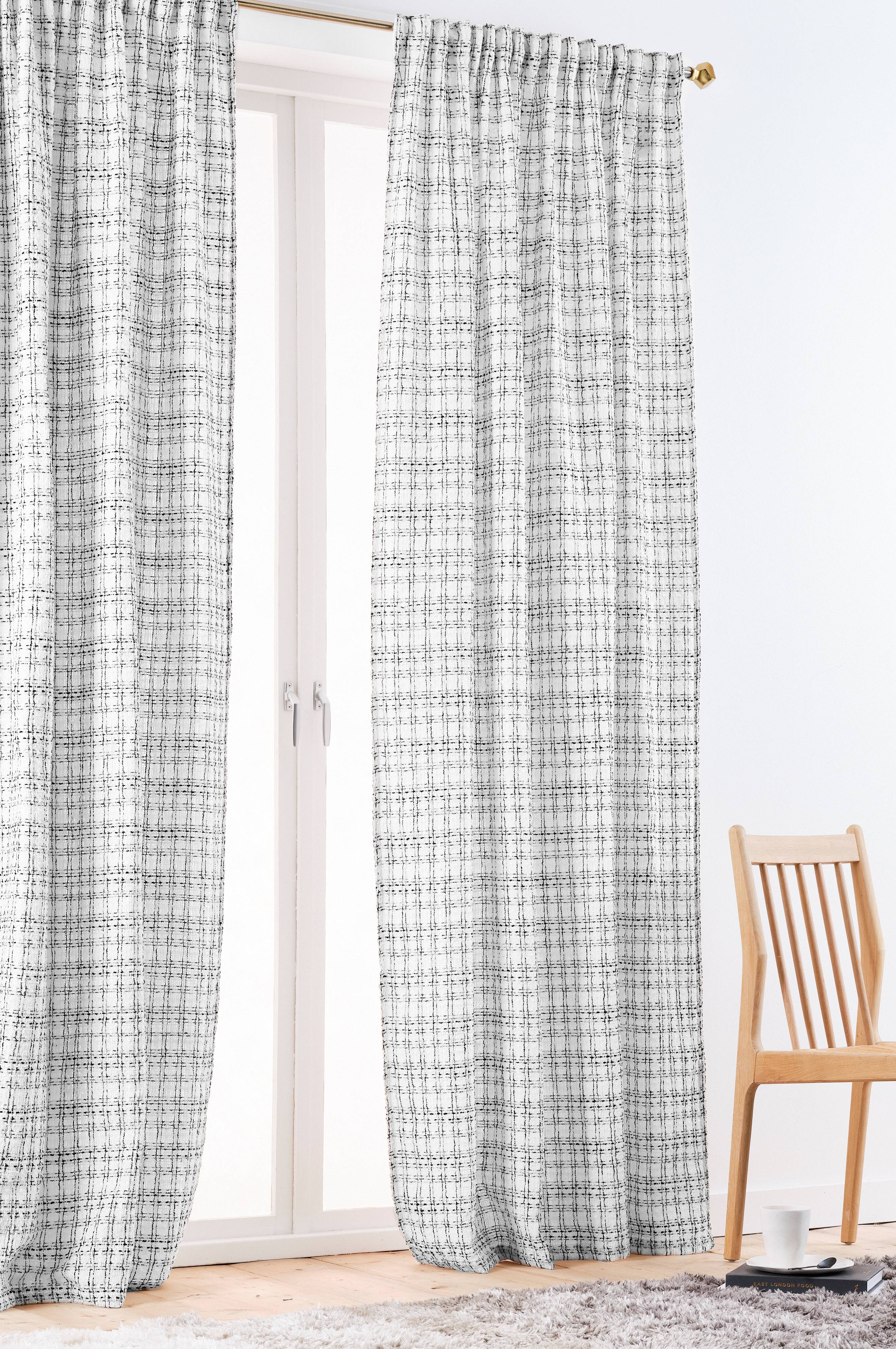 2 Gardinenschals aus Polyester mit einem stilvollen Karomuster, die deinen Fenstern einen neuen Look verleihen! Mit angenähtem Multifunktionsband. Die Gardine kann mit Fingerhaken, Tunnel oder verdeckten Schlaufen aufgehängt werden.