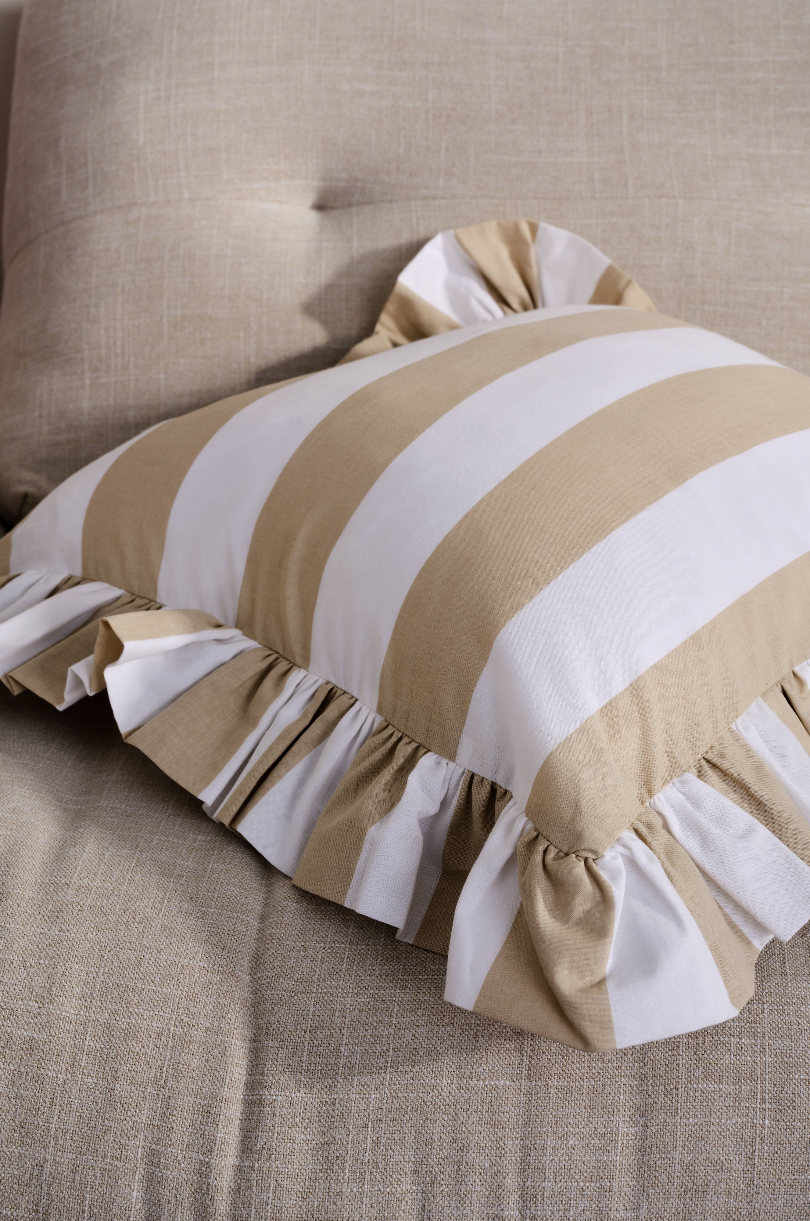 Die Kissenbezüge FREDDIE bringen mit ihrem auffälligen Streifenmuster und den charmanten Rüschenkanten einen dynamischen Touch in dein Wohnzimmer. Diese Bezüge sind sowohl stilvoll als auch bequem und verwandeln deinen Sitzbereich in einen lebendigen Mittelpunkt. FREDDIE lässt sich perfekt kombinieren und wertet deine Einrichtung auf, während sie gleichzeitig eine einladende Atmosphäre für Entspannung und geselliges Beisammensein schafft. Mit diesen bezaubernden Kissenbezügen bekommst du ein frisches Update.