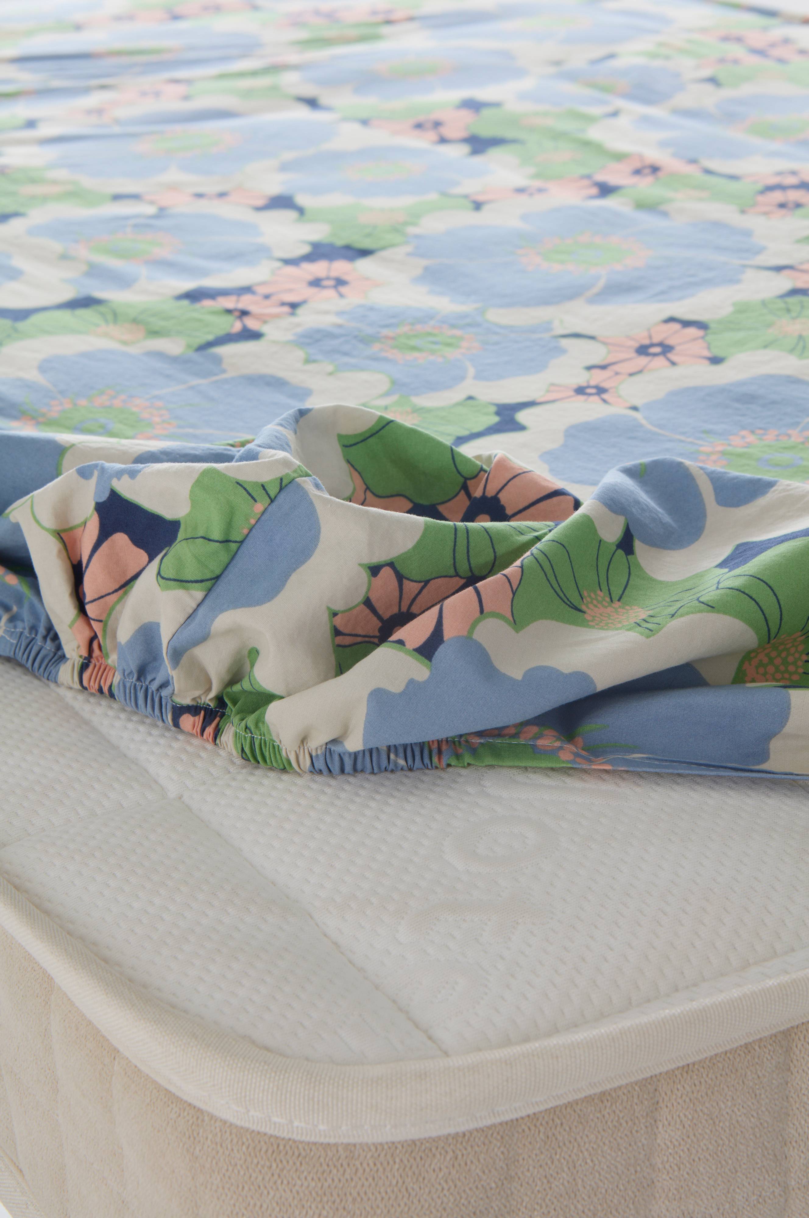 Das Spannbetttuch FRIDA verleiht dem Kinderzimmer einen Hauch von Retro-Charme. Es ist aus weichem ökologischem Baumwollperkal gefertigt und mit verspielten Prints verziert. Es lässt sich perfekt mit der passenden Version für Erwachsene kombinieren und sorgt so für einen einheitlichen Familienstil. Komfort für die Kleinsten trifft auf zeitloses Design.