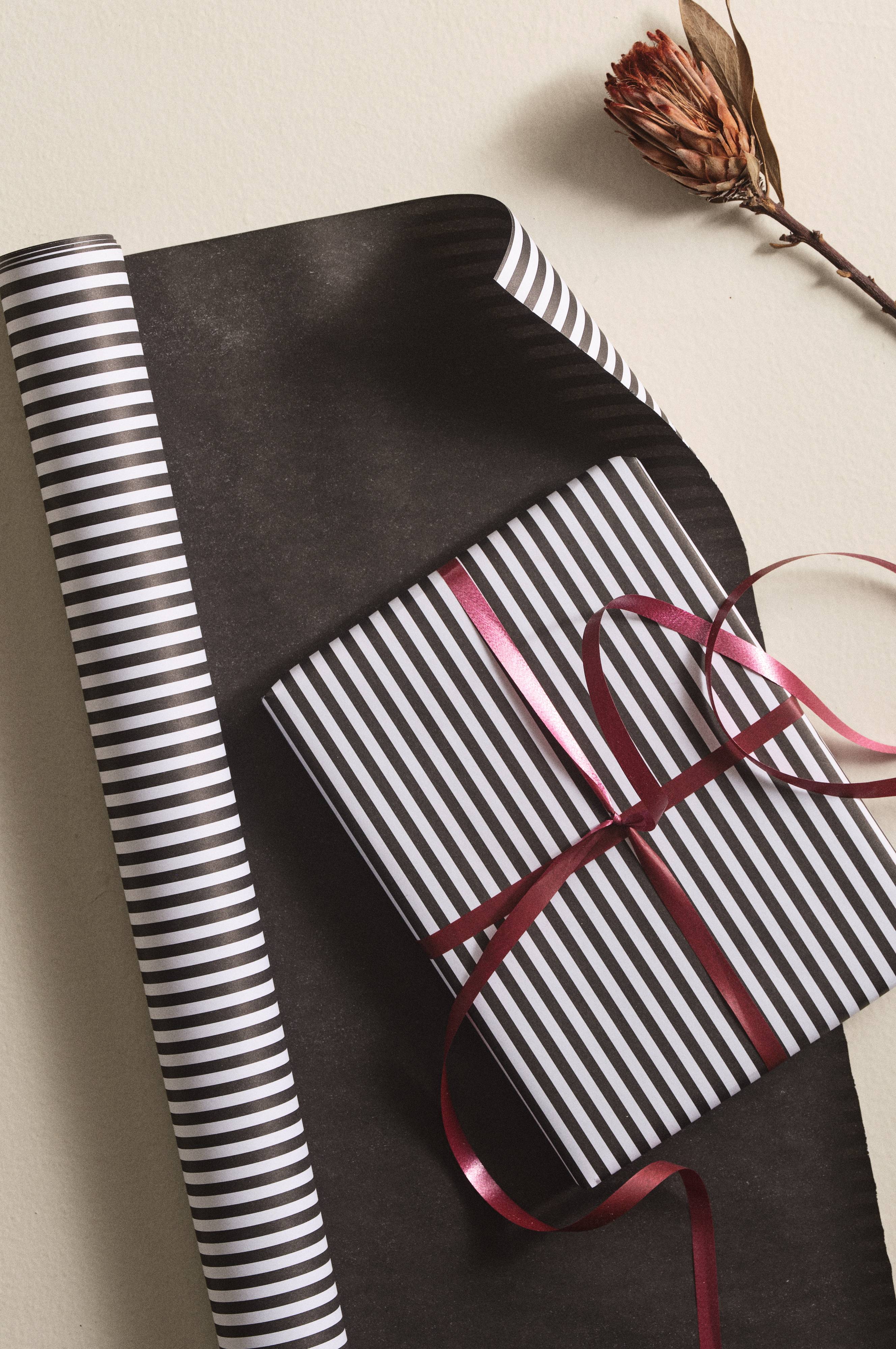 Gestreiftes Geschenkpapier aus FSC-zertifiziertem Papier. Dieses Papier hat aufgedruckte helle Streifen auf der Vorderseite und eine dunklere Rückseite. Daher kann man mit diesem Geschenkpapier sowohl einfarbige als auch gestreifte Päckchen packen und sich wunderbar variieren. Hergestellt in Schweden. Flächengewicht 80 g/m².