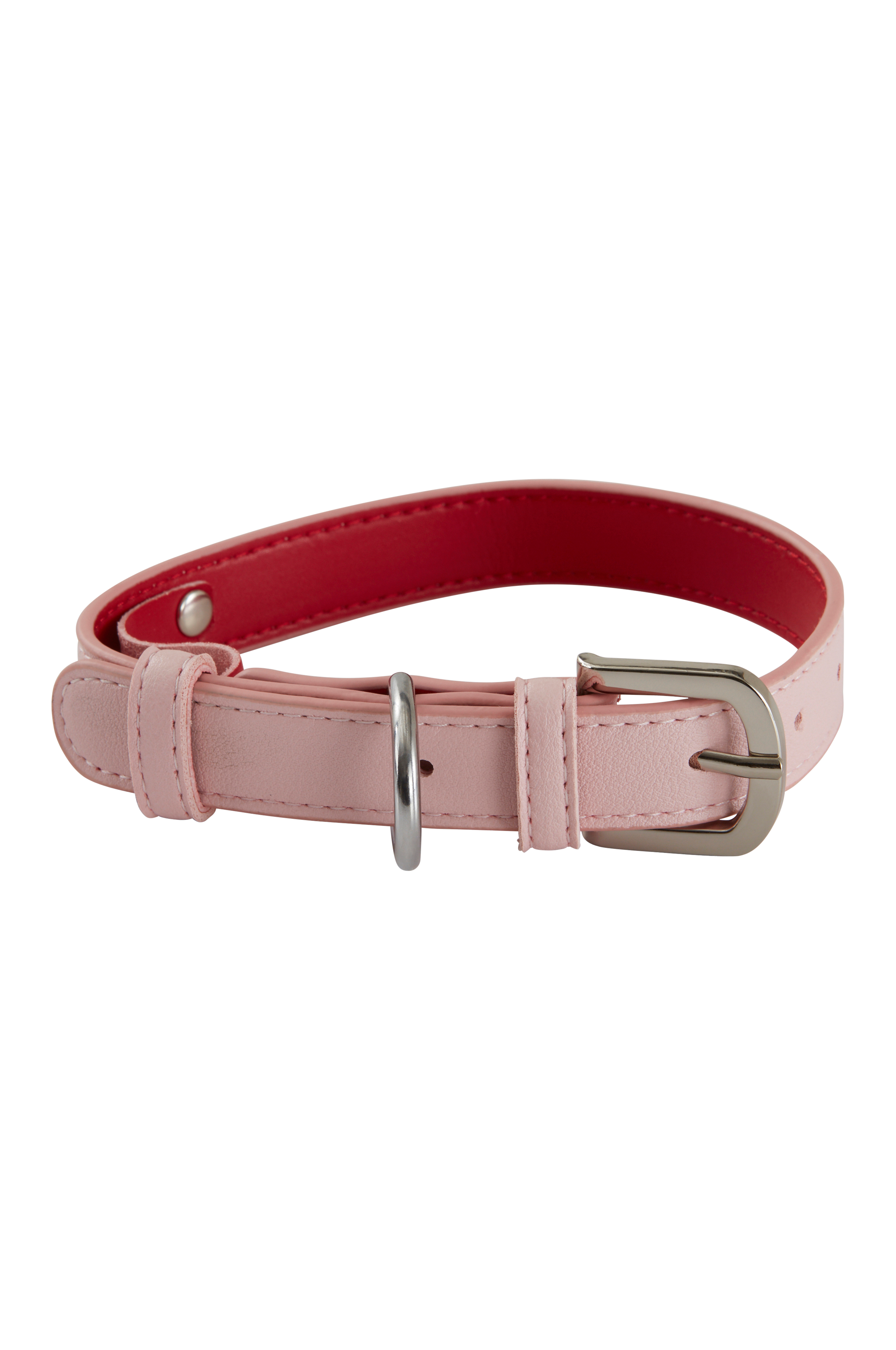 Ein Halsband für Hund oder Katze. Dieses Lederimitat-Halsband besteht aus Polyurethan und ist mit Microfaser weich gefüttert. Der Verschluss und der Leinenring haben eine silberfarbene Zinklegierung.