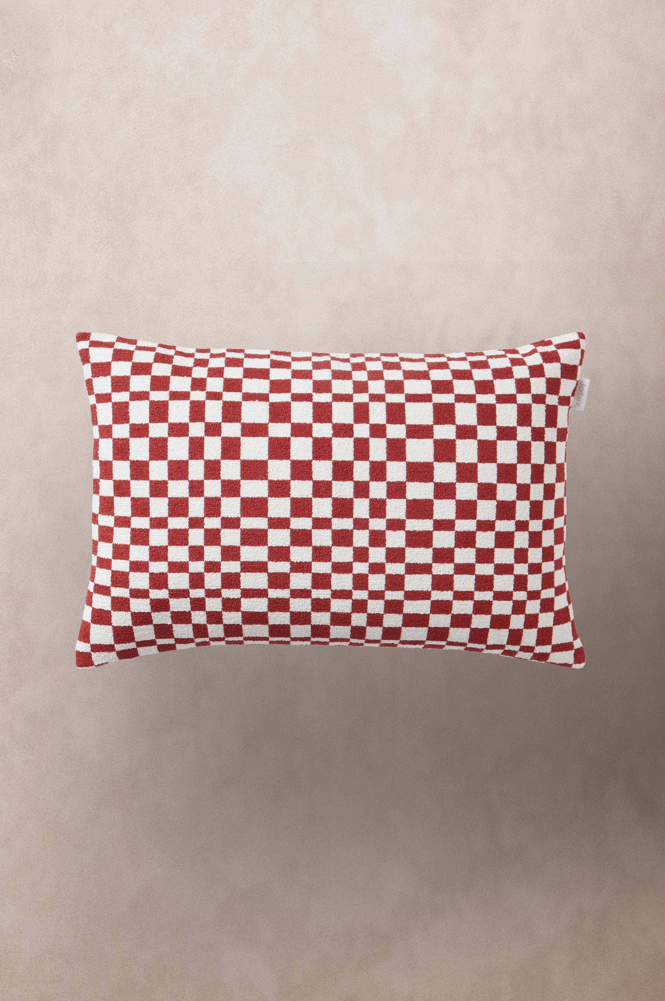 Kissenhülle mit Jacquardmuster. Die unregelmäßigen Vierecke sind abwechselnd in Weiß und in einer klaren Primärfarbe gehalten und erinnern an ein fantasievolles Schachbrett. Der Stoff ist stabil und etwas grober. Auch die Rückseite ist gemustert. Reißverschluss unten. Grammgewicht des Stoffs 760 g/m².