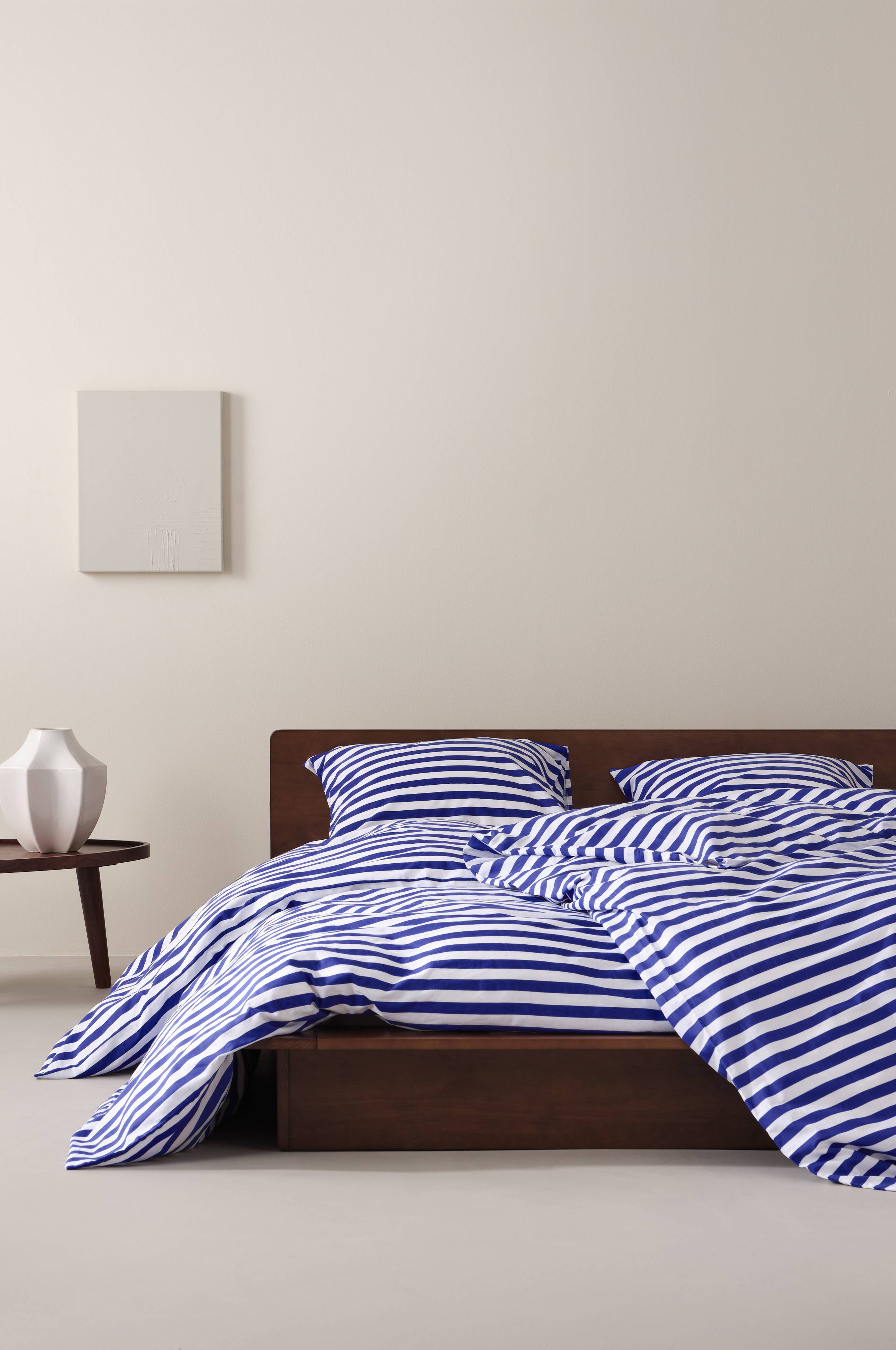 Gestreifter Bettbezug aus Baumwolle. Ein Print mit Querstreifen in sommerlichen Farben ziert beide Seiten. Die behagliche, weiche Baumwollqualität fühlt sich angenehm kühl an. Fadendichte 144 TC. (Mit der Fadendichte bzw. dem TC-Wert (Thread Count) wird die Anzahl der Fäden in Kette und Schuss pro Quadratzoll angegeben. Je höher die Fadendichte, desto höher die Qualität. Eine Ausnahme bildet Leinen, denn hier möchte man oft durch etwas lockereres Weben die gewünschte Haptik erzielen.)