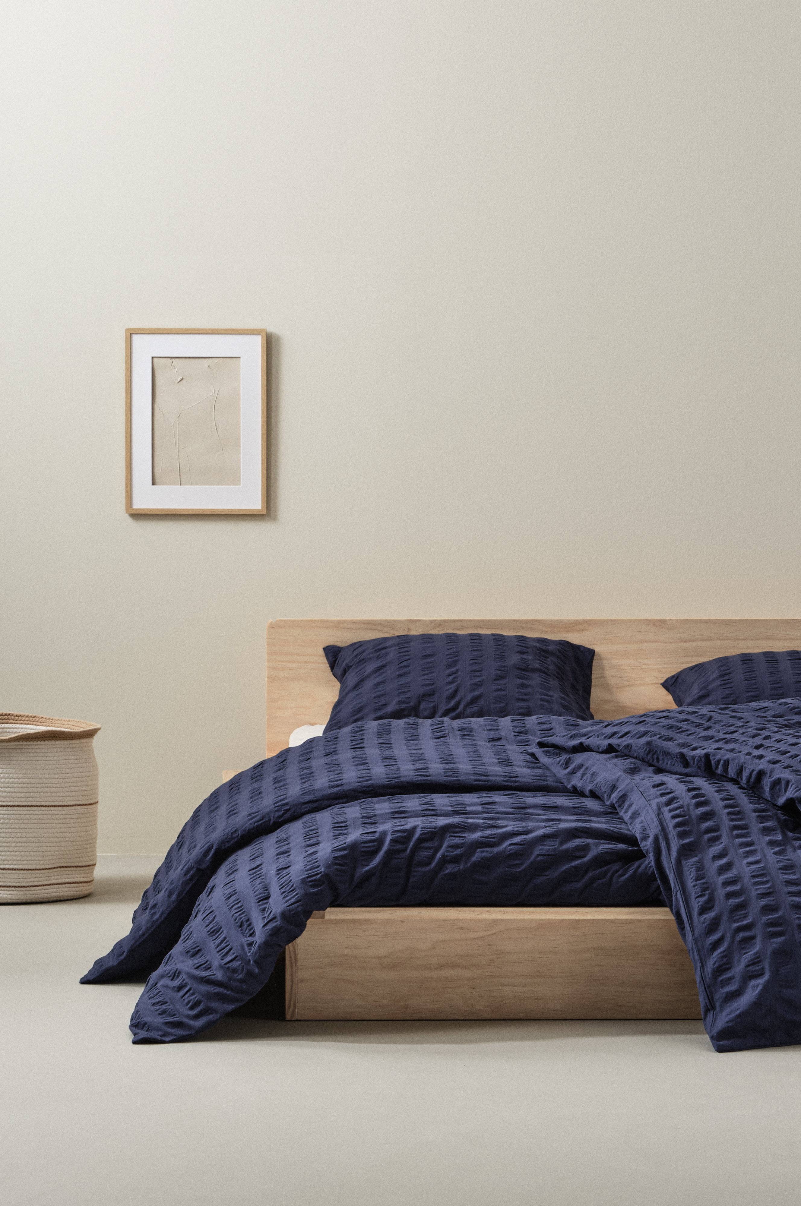 Seersucker-Bettbezug aus zertifizierter Bio-Baumwolle. Der luftige Seersucker fühlt sich angenehm kühl an und ist herrlich atmungsaktiv. Die Serie KIMMI ist einfarbig und gleichzeitig gestreift. Die Streifen sind abwechselnd glatt gewebt und aus Seersucker. Die garngefärbte, vorgewaschene Qualität besticht durch den weichen Griff. Fadendichte 120 TC. (Mit der Fadendichte bzw. dem TC-Wert (Thread Count) wird die Anzahl der Fäden in Kette und Schuss pro Quadratzoll angegeben. Je höher die Fadendichte, desto höher die Qualität.)