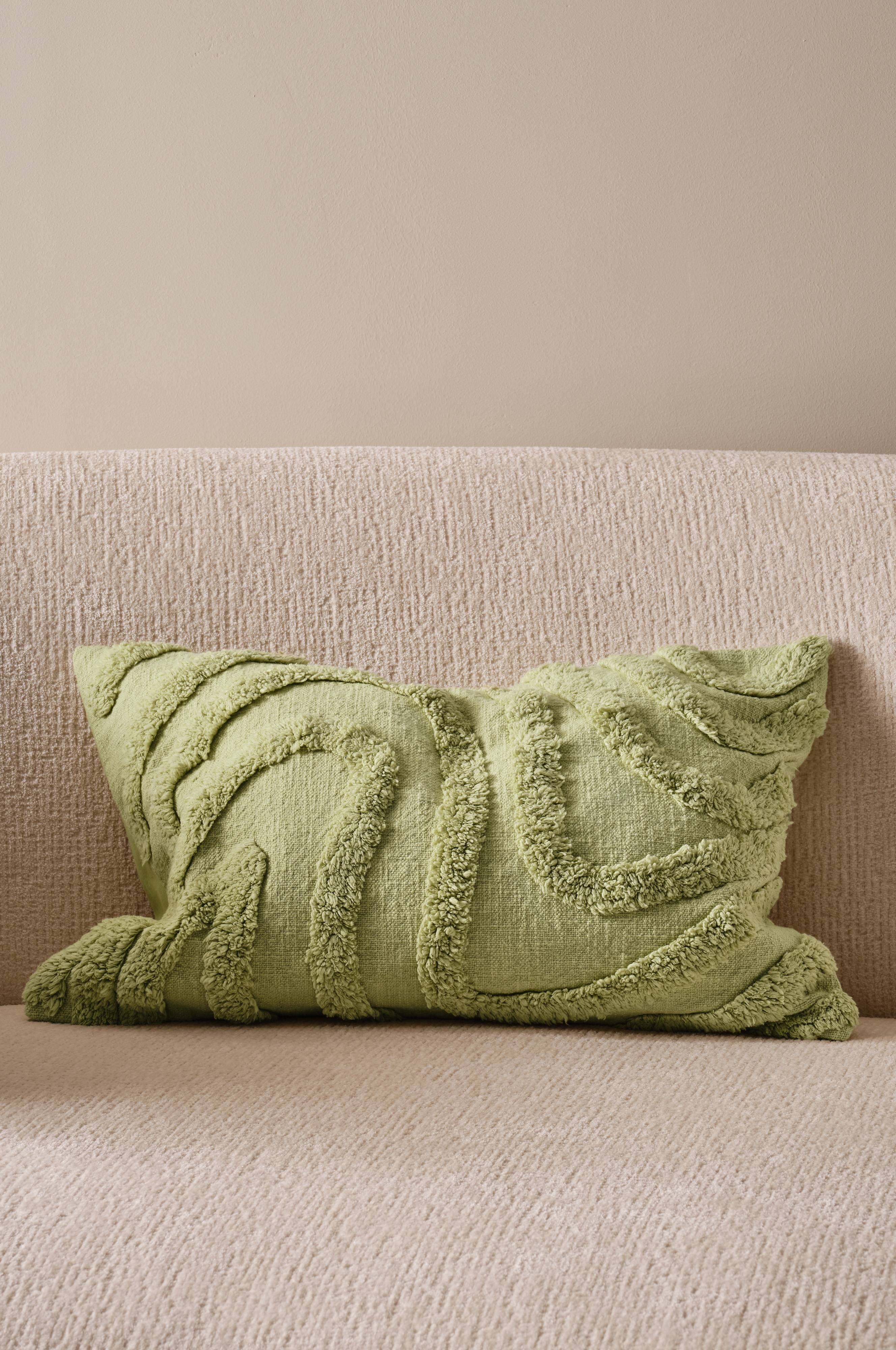 Ein kurzer Flor auf einem kräftigen Gewebe mit Slub-Effekt bildet das getuftete Wellenmuster dieser Kissenhülle. Gefütterte Vorderseite. Naturweiße gewebte Rückseite mit verdecktem Reißverschluss.