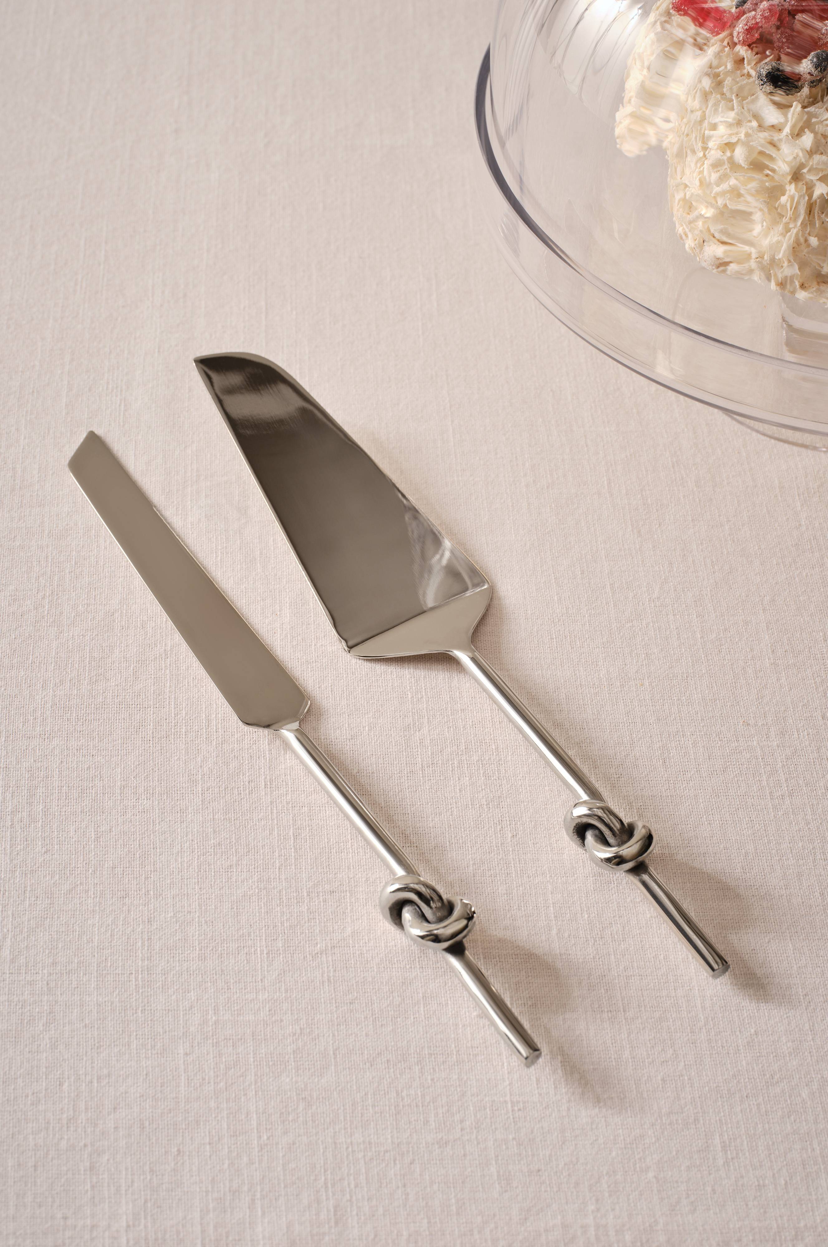 2-teiliges Servierset aus Edelstahl, perfekt, wenn du Freunde zu einer Party eingeladen hast. Das Set enthält einen Kuchenspachtel und ein Messer. Es eignet sich sowohl für Kuchen als auch für Käse. LOOP hat ein rustikales Design mit einem Knoten am Griff.