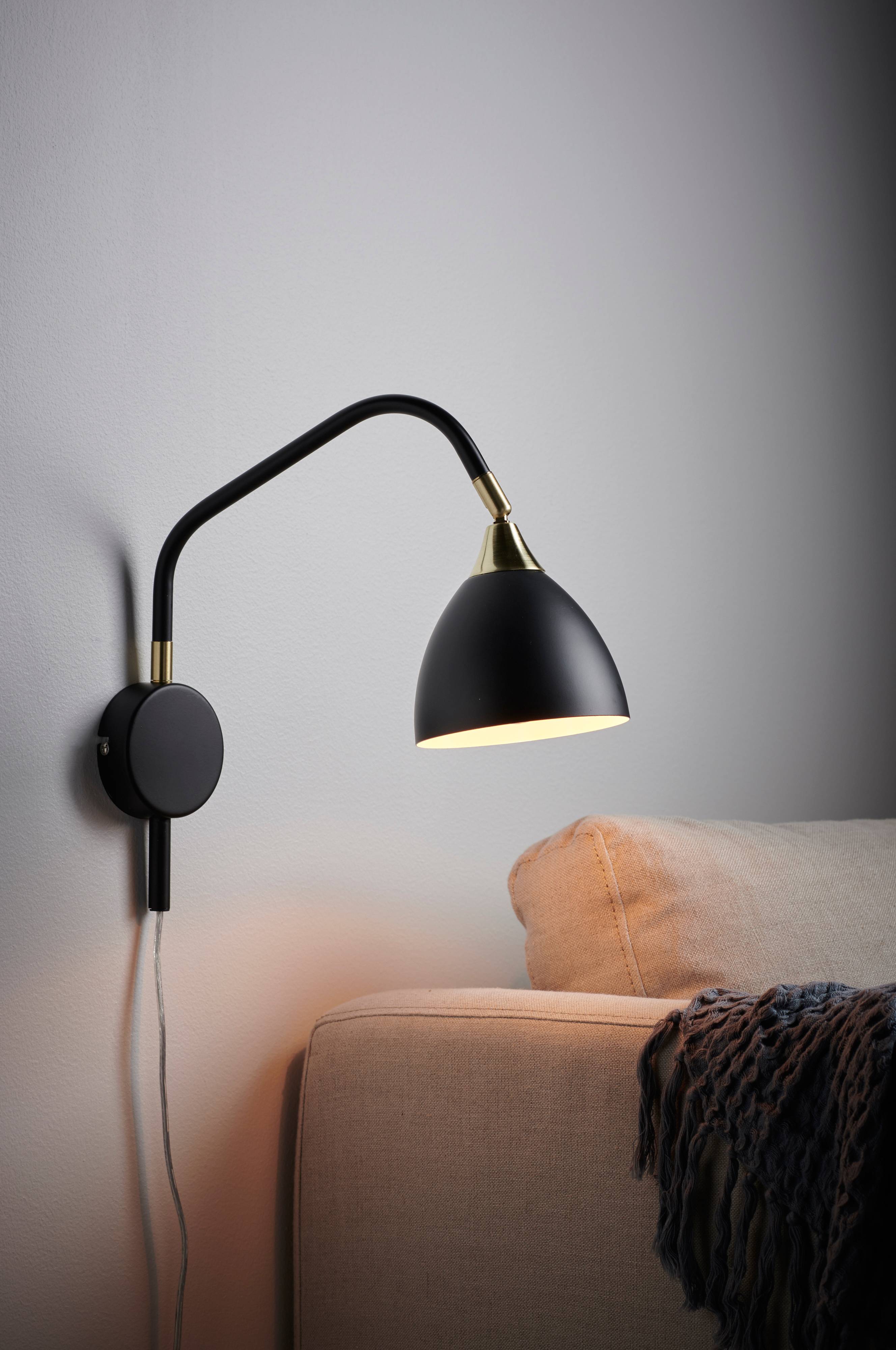 Beschreibung: Eine Wandleuchte aus Metall mit kleinen Messingdetails. Der Schirm lässt sich in verschiedene Richtungen winkeln. Wandabstand ca. 30 cm. Kabellänge 2 m.