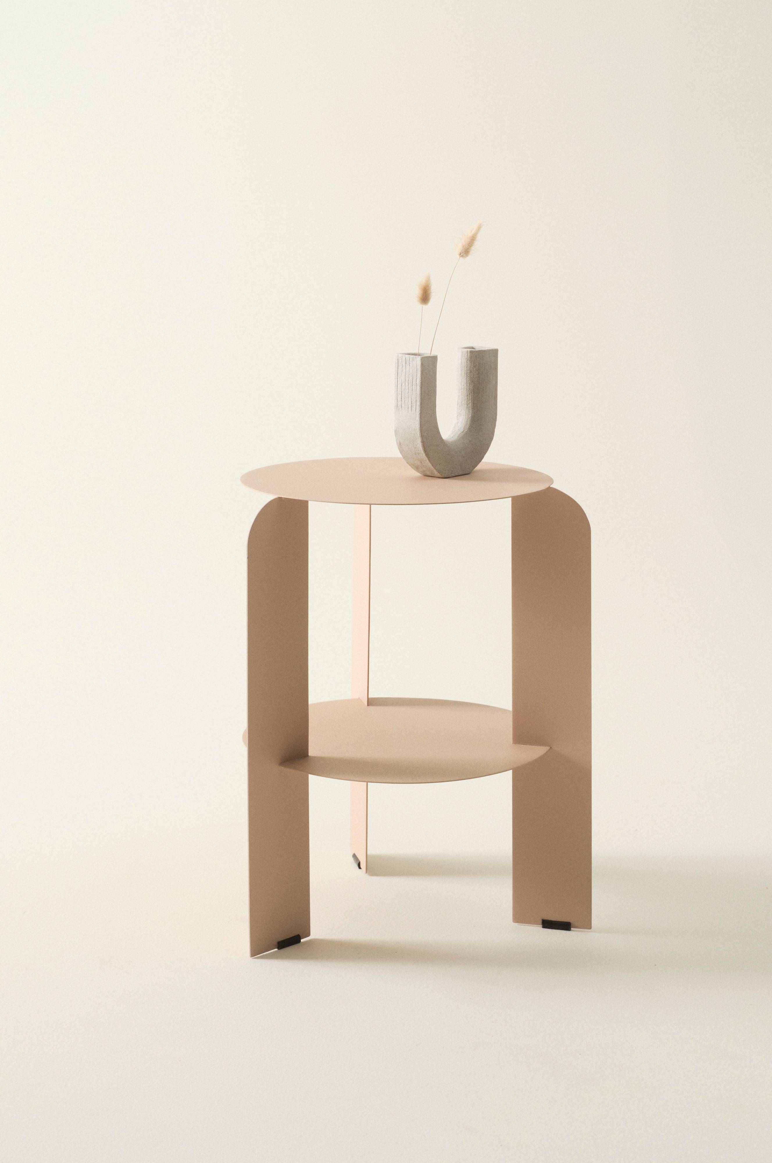 MAUREN ist ein runder Beistelltisch aus Eisen mit einer dünnen Tischplatte und einer ebenso dünnen Ablage darunter. Die drei geraden Beine haben abgerundete Ecken, die oben etwas überstehen. Der Tisch ist mit einer Farbe lackiert, die ihm eine leichte Struktur verleiht. Kleine Gummigleiter schützen empfindliche Böden.