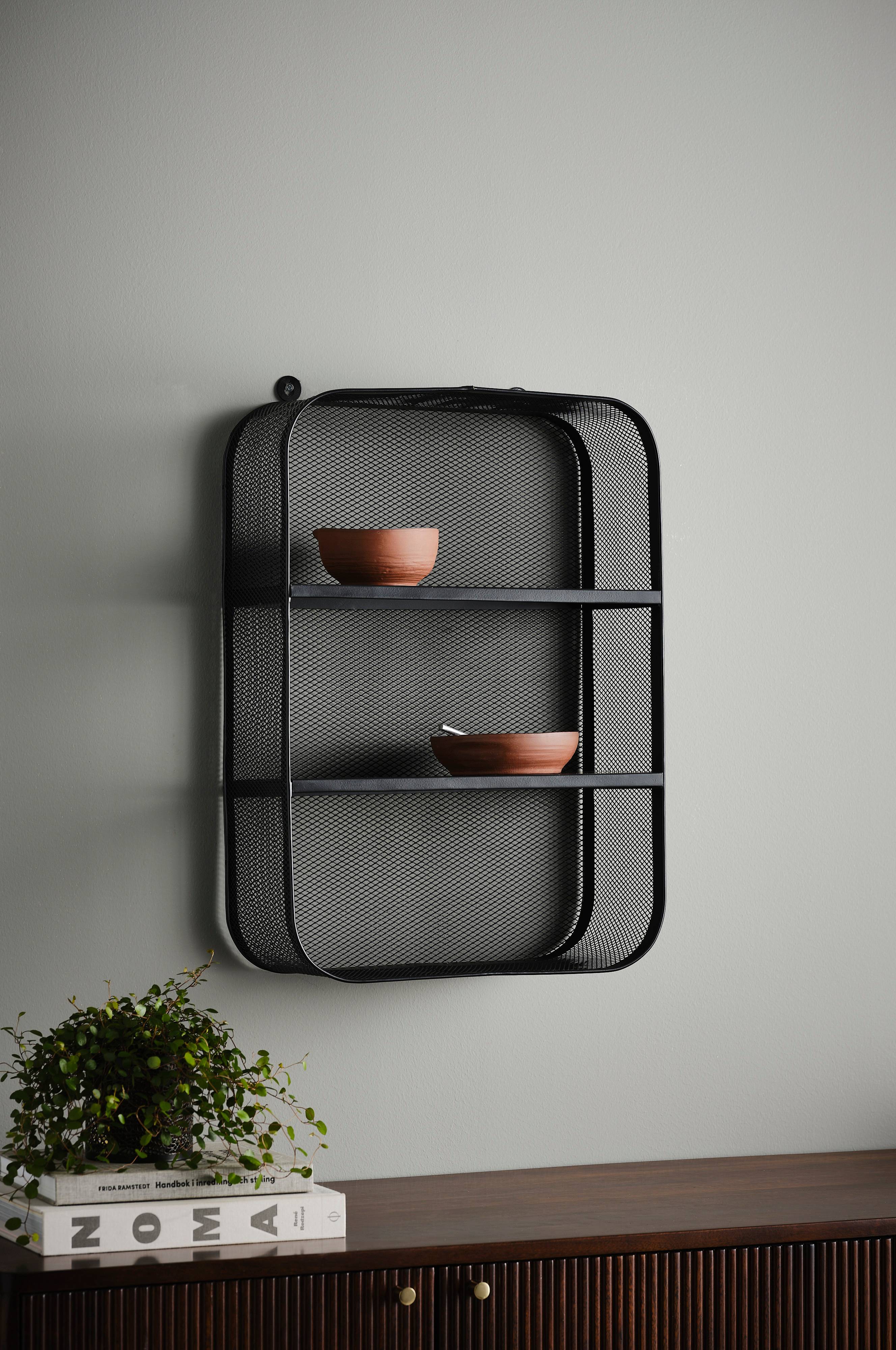 Schönes Wandregal aus pulverbeschichtetem Metall mit einem Metallnetz an den Seiten und auf der Rückseite. Löcher zur Wandbefestigung. Maximale Belastung 12 kg.