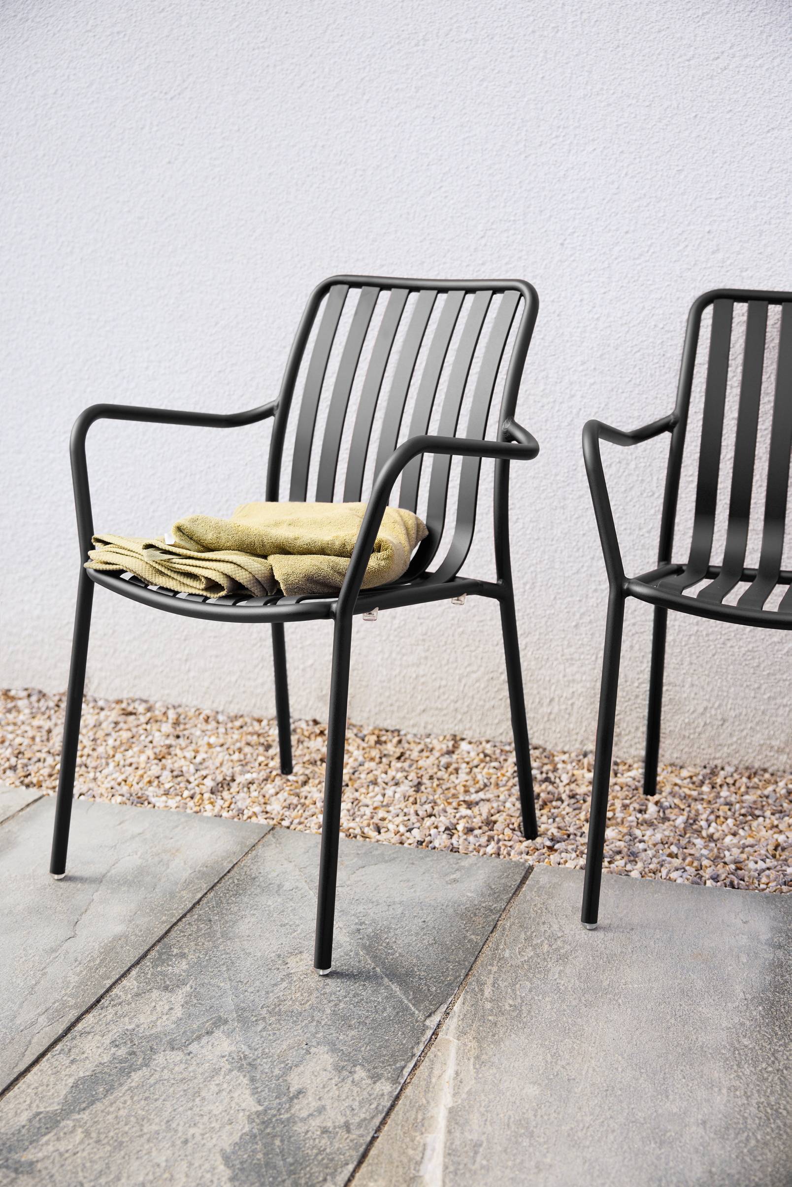 2 Armlehnstühle aus Aluminium mit pulverbeschichtetem Finish. NANTERRE ist ein leichter Armlehnstuhl mit schöner weicher Linienführung. Bequem zu sitzen und leicht zu verräumen, denn Aluminium ist ein Material mit geringem Gewicht. Da Aluminium nicht rostet, ist NANTERRE außentauglich und wird einfach abgewischt.