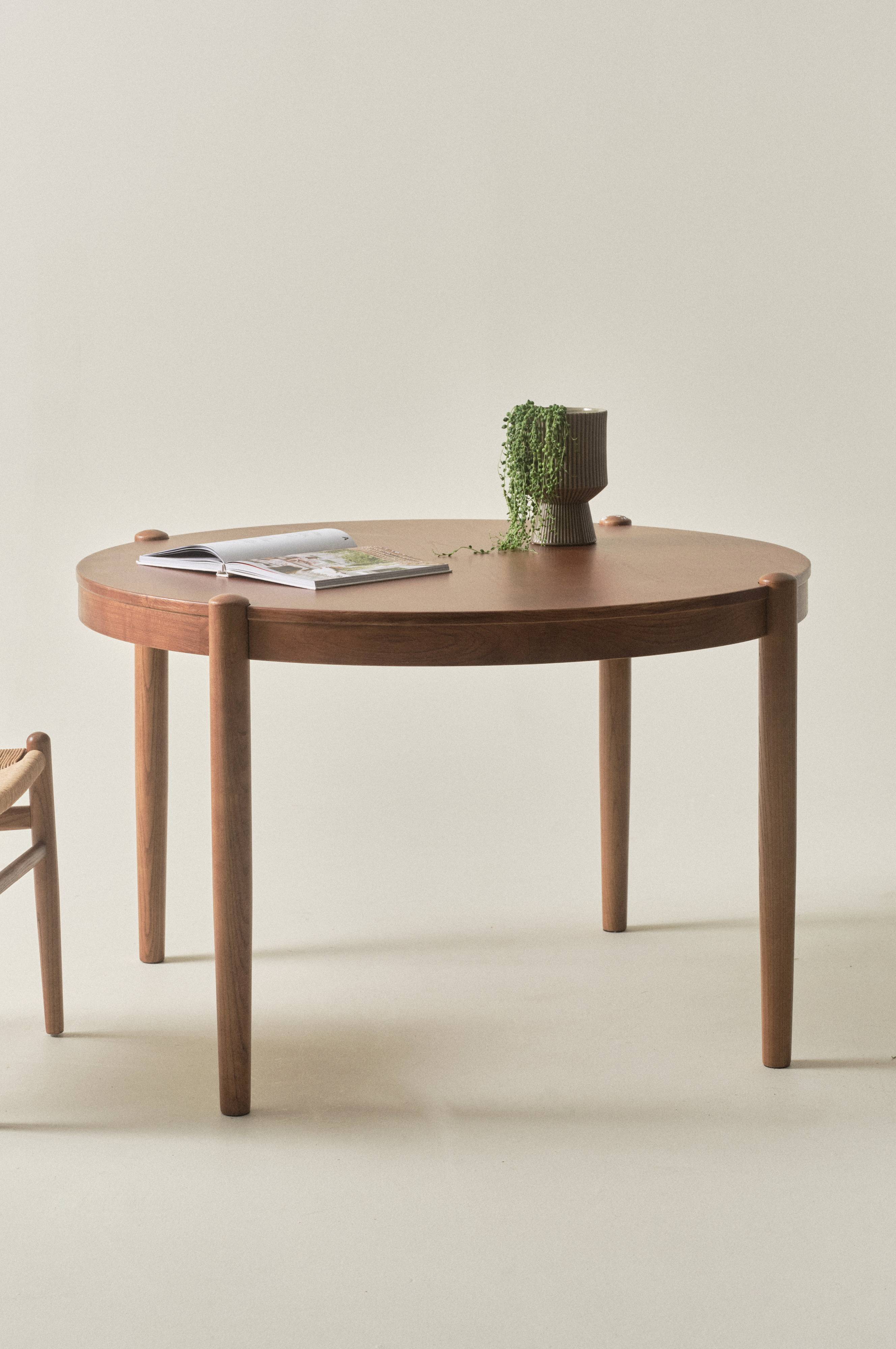 Dieser runde Esstisch ist aus Ulmenholz und die Tischplatte hat ein Furnier aus Ulme. Die weit außen angebrachten und gleichzeitig in die Tischplatte eingelassenen Beine verleihen dem Tisch seinen besonderen Charakter. Dieser Tisch ist in mehreren schönen Ausführungen erhältlich. Du wählst den Farbton, der am besten zu deinem Zuhause passt.