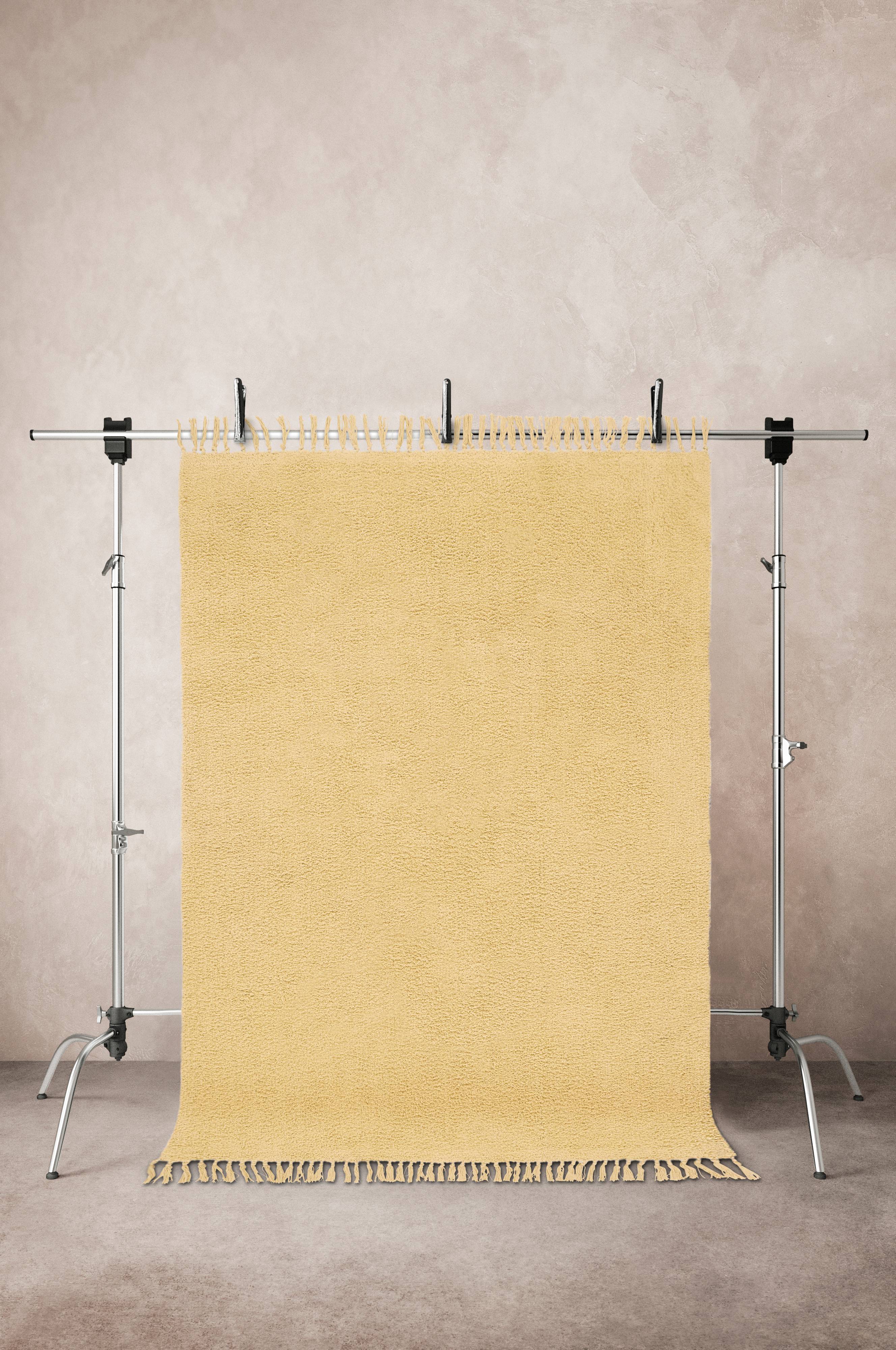 Getufteter Baumwollteppich mit weichem Flor. Der einfarbige Teppich sorgt mit seiner sommerlichen Farbe für fröhliche Vibes. Fransenlänge 10 cm. Florhöhe 1 cm. Dicke 1,1 cm. 1500 g/m².