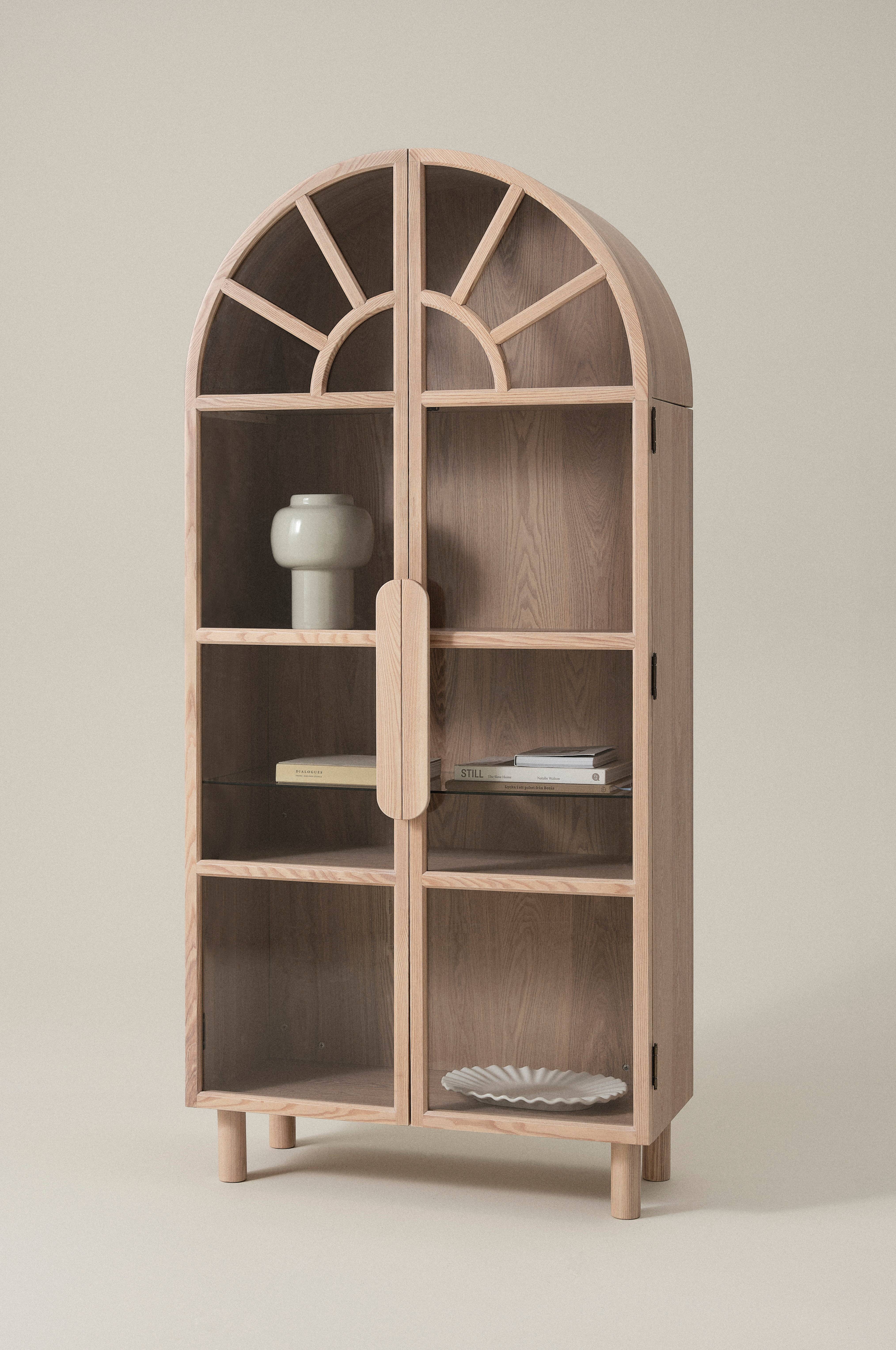 Bei dieser Vitrine aus Eschenholz und MDF mit Eschenfurnier ist das gesamte Material FSC-zertifiziert und mit wasserbasiertem Lack behandelt. Durch die Rundung oben und die Sprossentüren ist der Schrank besonders dekorativ. SANDOR präsentiert seinen Inhalt auf geschmackvolle Weise. Das Bogenelement oben, die Beine und die Türen mit Griffen sind aus massivem Eschenholz gearbeitet. Seiten, Rückwand, Boden und Einlegeböden bestehen aus MDF mit Eschenfurnier. Neben drei festen Böden aus MDF dient auch ein flexibler Einlegeboden aus Glas als Ablagefläche. Wandhalterung auf der Rückseite. Einige Montageschritte sind erforderlich. Inklusive Montageanleitung.