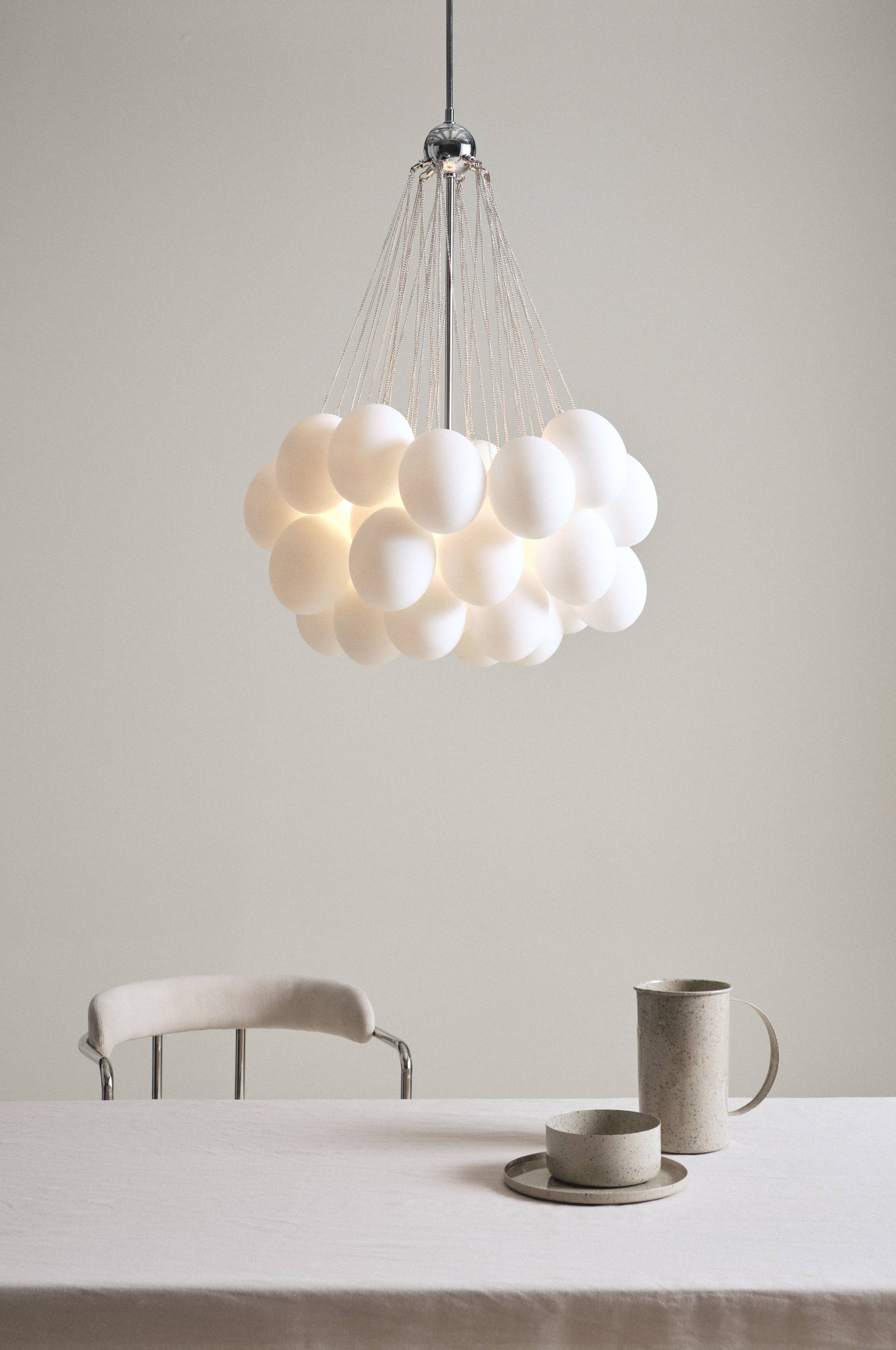 Deckenleuchte mit 37 runden Kugeln aus Opalglas. In sechs der Kuppeln befindet sich ein Kerzenhalter, der die Lampe in ein angenehmes Licht taucht. Die Kuppeln hängen in einer schönen Traube und bilden eine prächtige und aufregende Deckenlampe, zum Beispiel über deinem Esstisch. Der Rahmen und der Deckenbecher sind aus Eisen gefertigt.