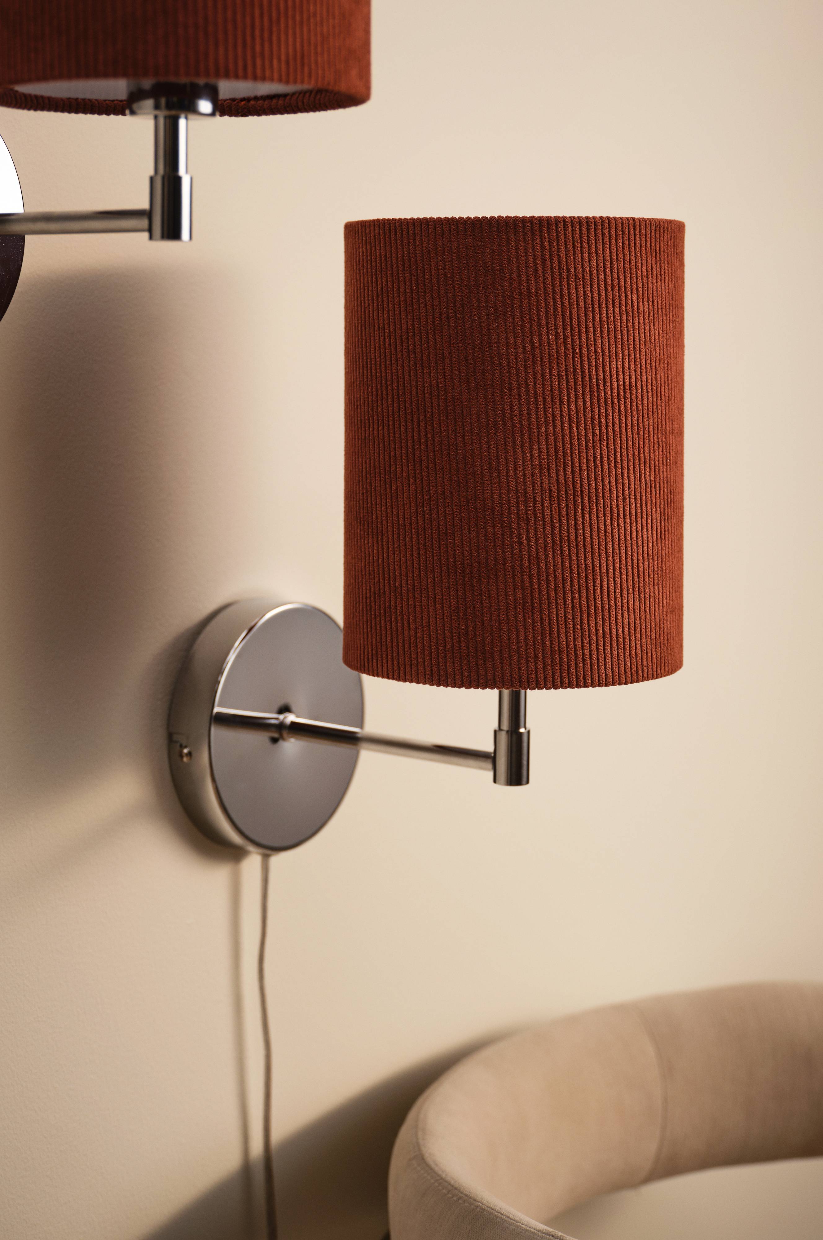 Die Wandleuchte SETH hat einen eleganten Chromsockel und einen retro-inspirierten Kord-Lampenschirm, der jedem Raum einen Hauch von Vintage-Charme verleiht. Im Zweierpack verkauft, können diese Lampen deine Einrichtung nahtlos ergänzen. Kombiniere sie mit der passenden Tischlampe für einen einheitlichen Look, der Wärme und Stil in dein Zuhause bringt. Eine zeitlose Wahl für alle, die klassische Designelemente zu schätzen wissen.