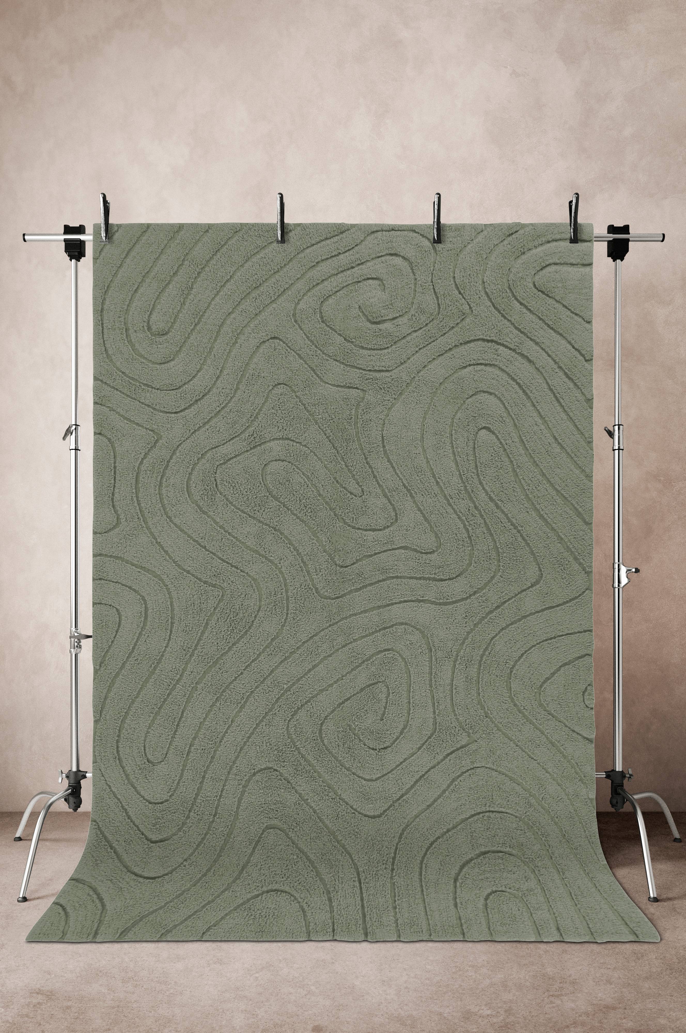 Getufteter Baumwollteppich mit einem dichten Flor aus herrlich weicher Baumwolle. Das unregelmäßig wogende, dezente Muster entsteht durch die unterschiedlichen Florhöhen. Florhöhe 1 cm. Dicke 1,1 cm. 1660 g/m².