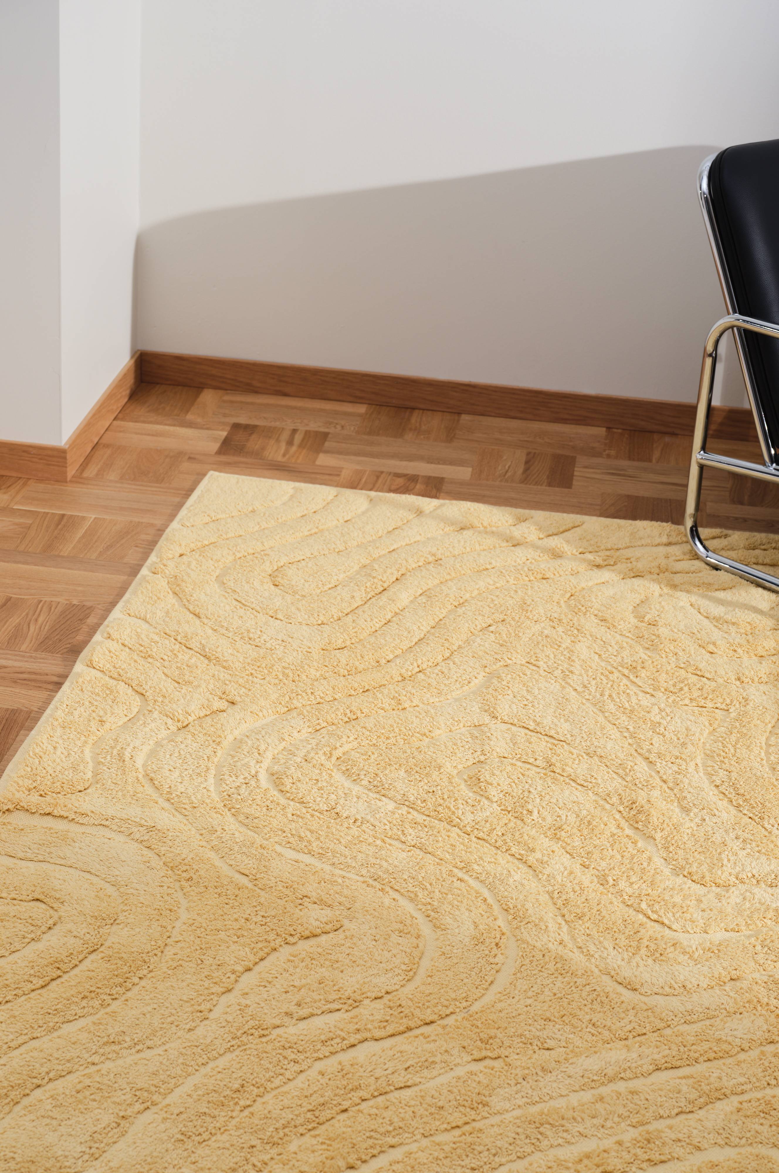 Getufteter Baumwollteppich mit einem dichten Flor aus herrlich weicher Baumwolle. Das unregelmäßig wogende, dezente Muster entsteht durch die unterschiedlichen Florhöhen. Florhöhe 1 cm. Dicke 1,1 cm. 1660 g/m².