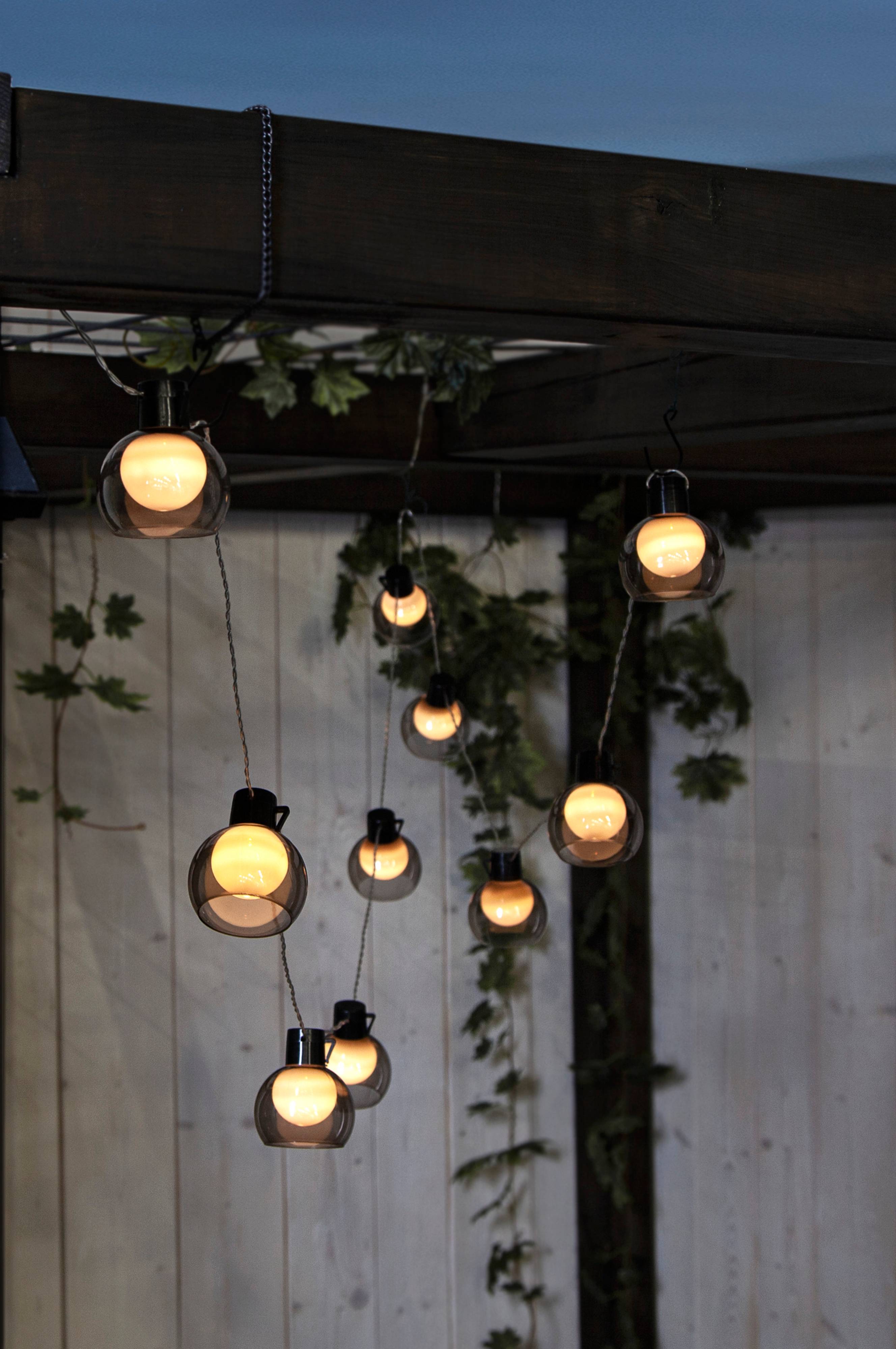 Solarbetriebene Lichterkette mit 10 dekorativen rauchfarbigen Kapseln mit einer inneren, opalfarbigen Kapsel mit einem warmweißen Lichtschein. Lichtfarbe warmweiß. Die Länge der Lichterkette beträcht 270 cm. Lampenabstand: 30 cm. Das Anschlusskabel ist 20 m lang (PVC). Die Kapseln sind 8 cm hoch, der Durchmesser beträgt 7 cm. Inklusive LED-Leuchtmittel und Batterie für das Lichtrelais. Gesamtleistung 0,24W. 1,2 V DC.