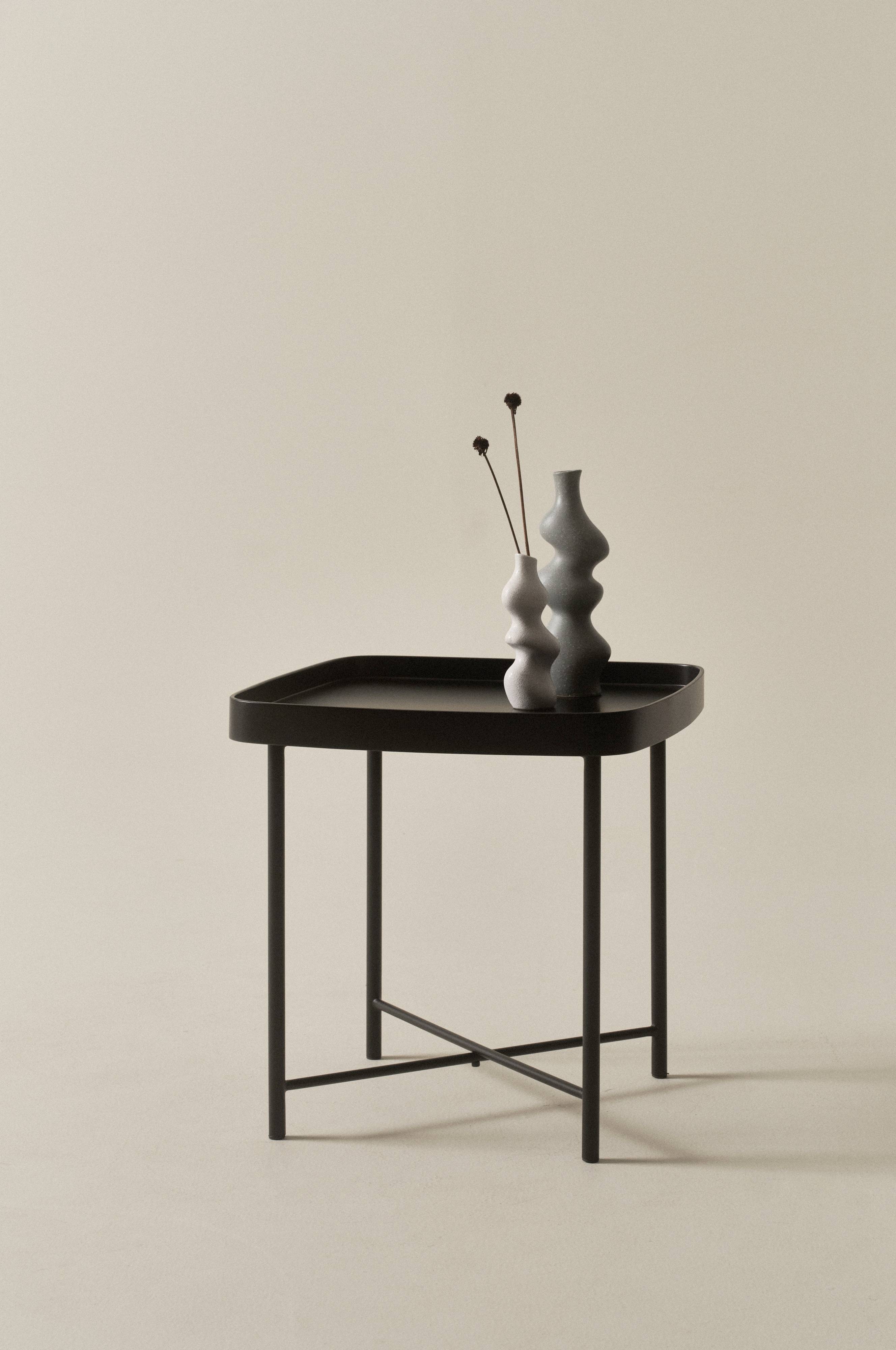 Quadratischer Couchtisch mit eleganten Beinen aus Stahl und einer Tischplatte aus MDF mit FSC-Kennzeichnung. Die Tischplatte hat eine schwarz lackierte, matte Oberfläche. Ein schönes Detail ist der kleine, umlaufende Rand der Tischplatte. Das Gestell ist im passenden Farbton pulverbeschichtet. TACOMA passt so gut wie überall und fällt immer ein wenig auf. Einige Montageschritte sind erforderlich. Inklusive Montageanleitung.