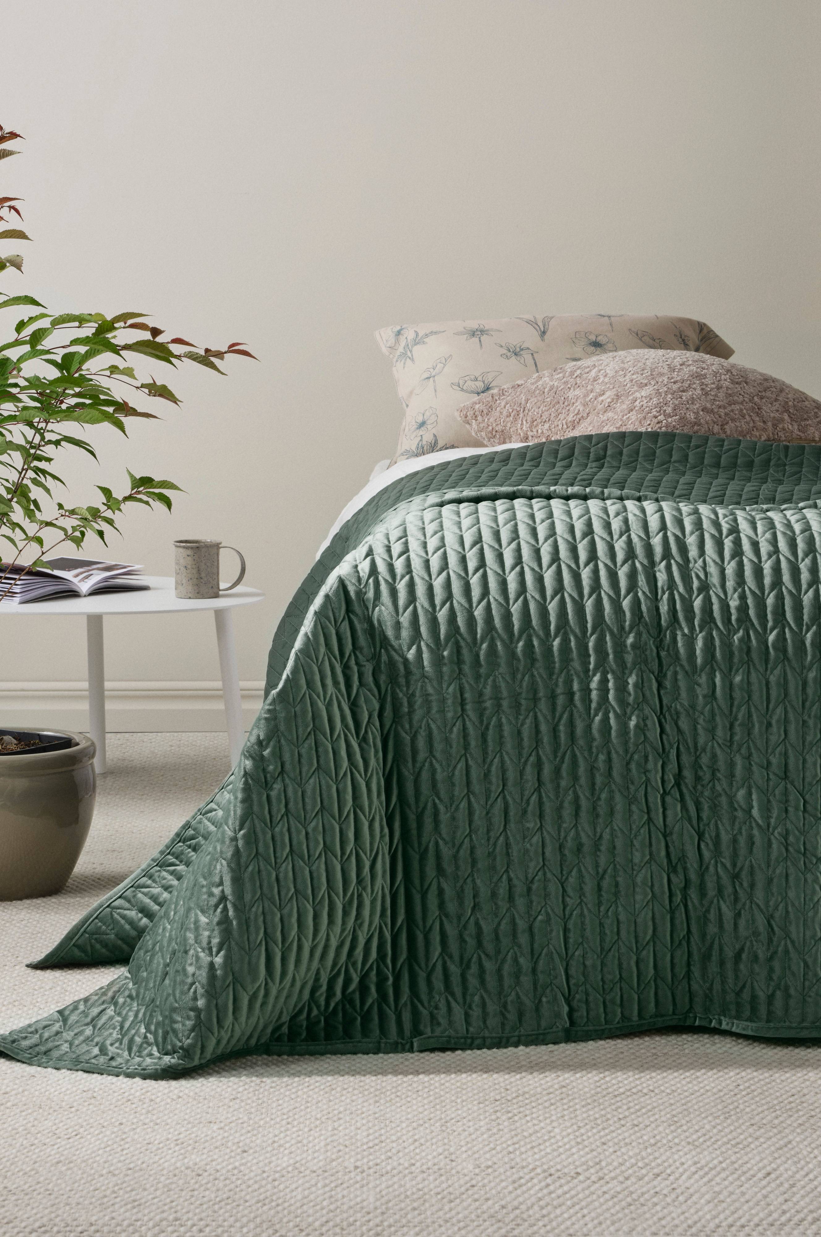 Tagesdecke aus gequiltetem Samt mit dekorativen Nähten und Einfassung.