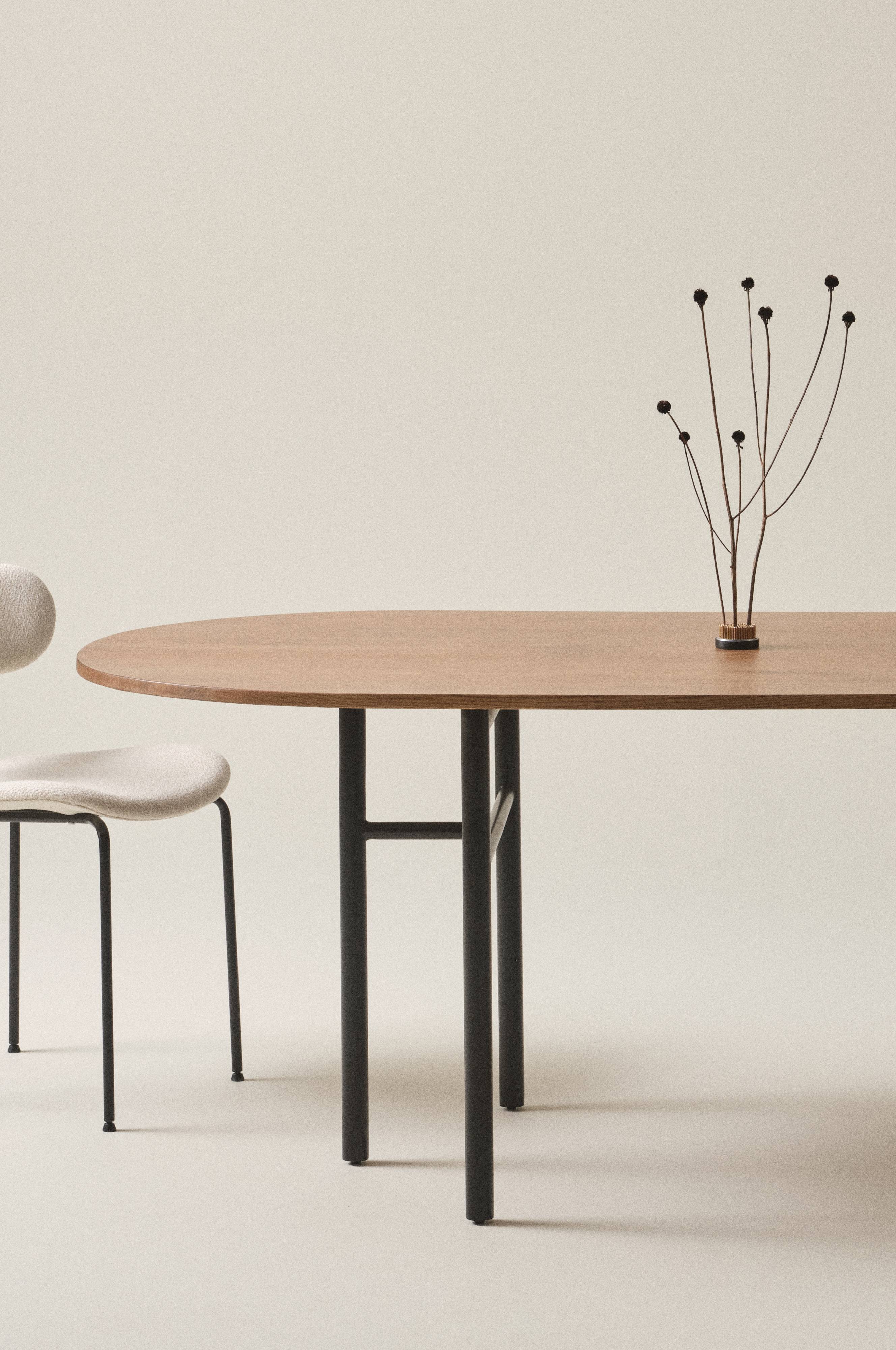 Ein ellipsenförmiger Esstisch mit einer Tischplatte aus massiver Eiche und einem Gestell aus Eisen. Die Metallbeine sind mattschwarz, während die Tischplatte ein weiches, gekalktes Finish aufweist. Die zierlichen Beine sorgen für einen leichten, luftigen Eindruck. Die Kombination mit der rustikalen Tischplatte wirkt überaus harmonisch. Die Ellipsenform des Tisches ist sehr angenehm und bietet das gleiche Gefühl von Gemeinschaft wie ein runder Tisch. Einige Montageschritte sind erforderlich. Inklusive Montageanleitung.