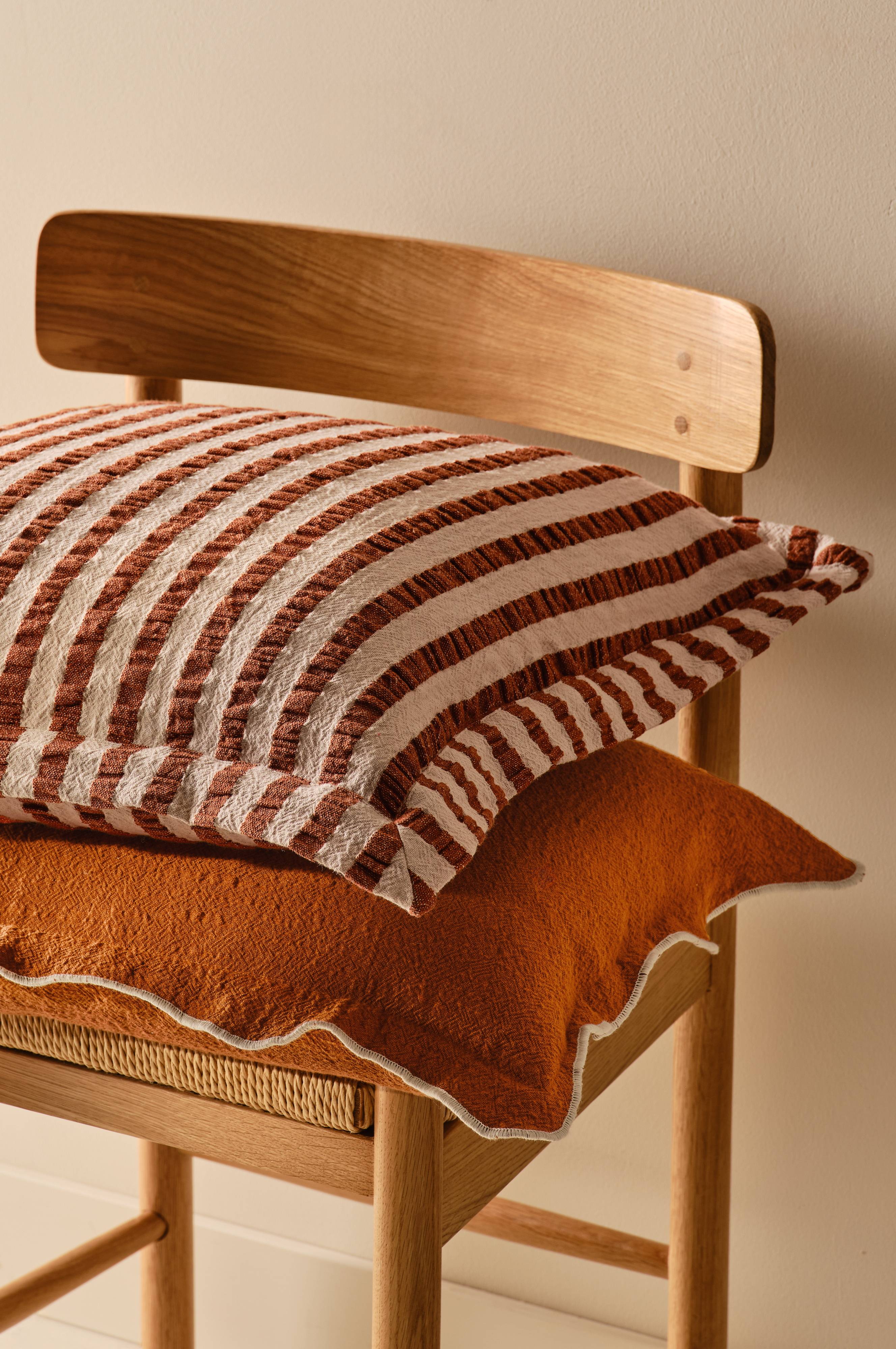 Der Kissenbezug WENDY verleiht jedem Interieur ein einzigartiges Flair. Dieses Set besteht aus zwei Kissen, von denen eines mit eleganten Streifen und einem Flügeldetail versehen ist, während das andere einen gewellten Rand mit einem kontrastierenden Finish aufweist. Diese Kissenbezüge eignen sich perfekt, um deinem Wohnraum Tiefe und Charakter zu verleihen, und bieten einen charmanten Design-Twist für moderne Innenräume.